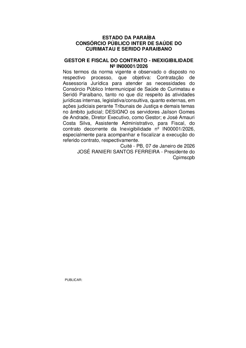 GESTOR E FISCAL DO CONTRATO - INEXIGIBILIDADE N° IN 0001/2026