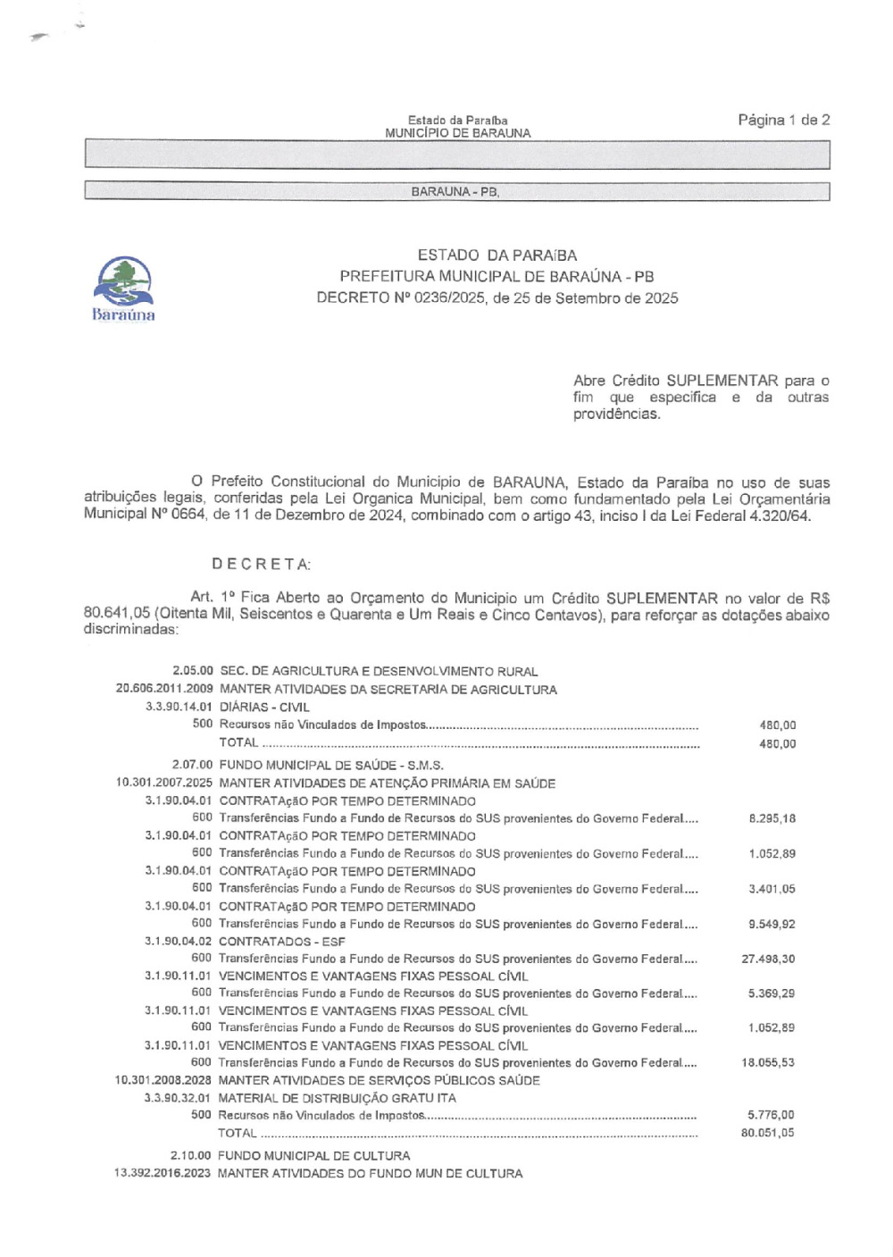 DECRETO Nº 0236/2025 ABRE CREDITO SUPLEMENTAR. - 22 DE JANEIRO DE 2026.