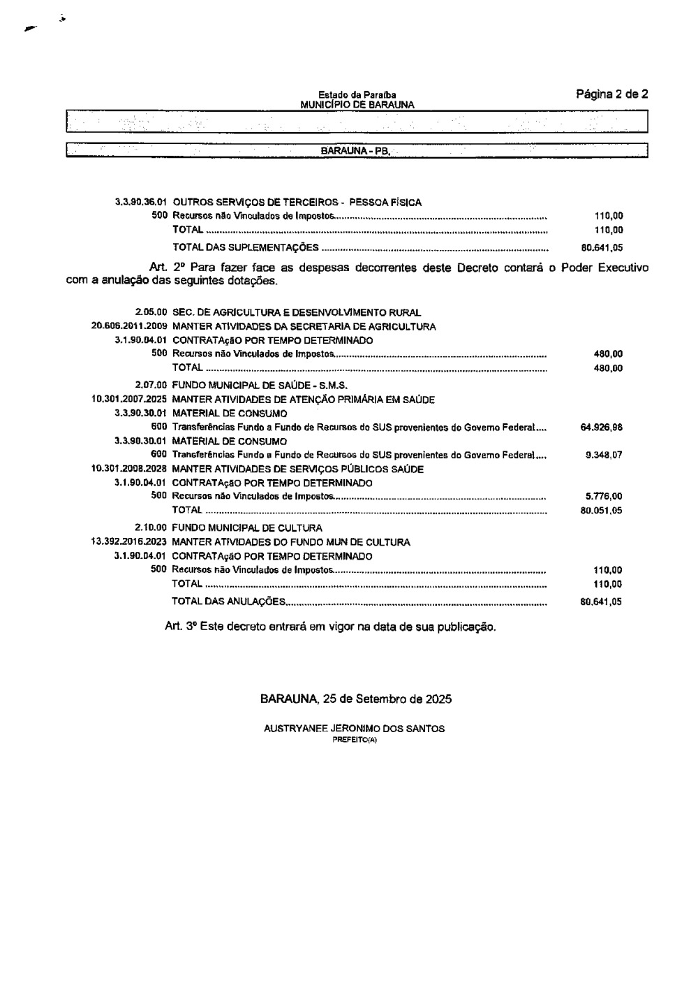 Conforme MP n° 2.200-2 de 24/08/2001, que institui a infraestrutura de chaves Públicas. Matéria Publicada no Diário Oficial do Município de Baraúna/PB no dia - Edição 01409.