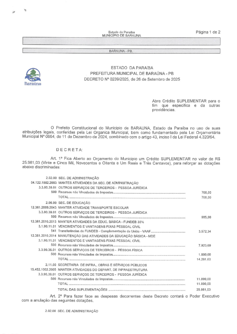 DECRETO Nº 0239/2025 ABRE CREDITO SUPLEMENTAR. - 22 DE JANEIRO DE 2026.