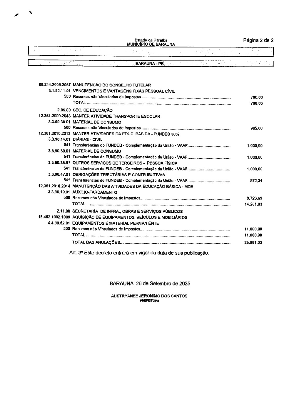 Conforme MP n° 2.200-2 de 24/08/2001, que institui a infraestrutura de chaves Públicas. Matéria Publicada no Diário Oficial do Município de Baraúna/PB no dia - Edição 01409.