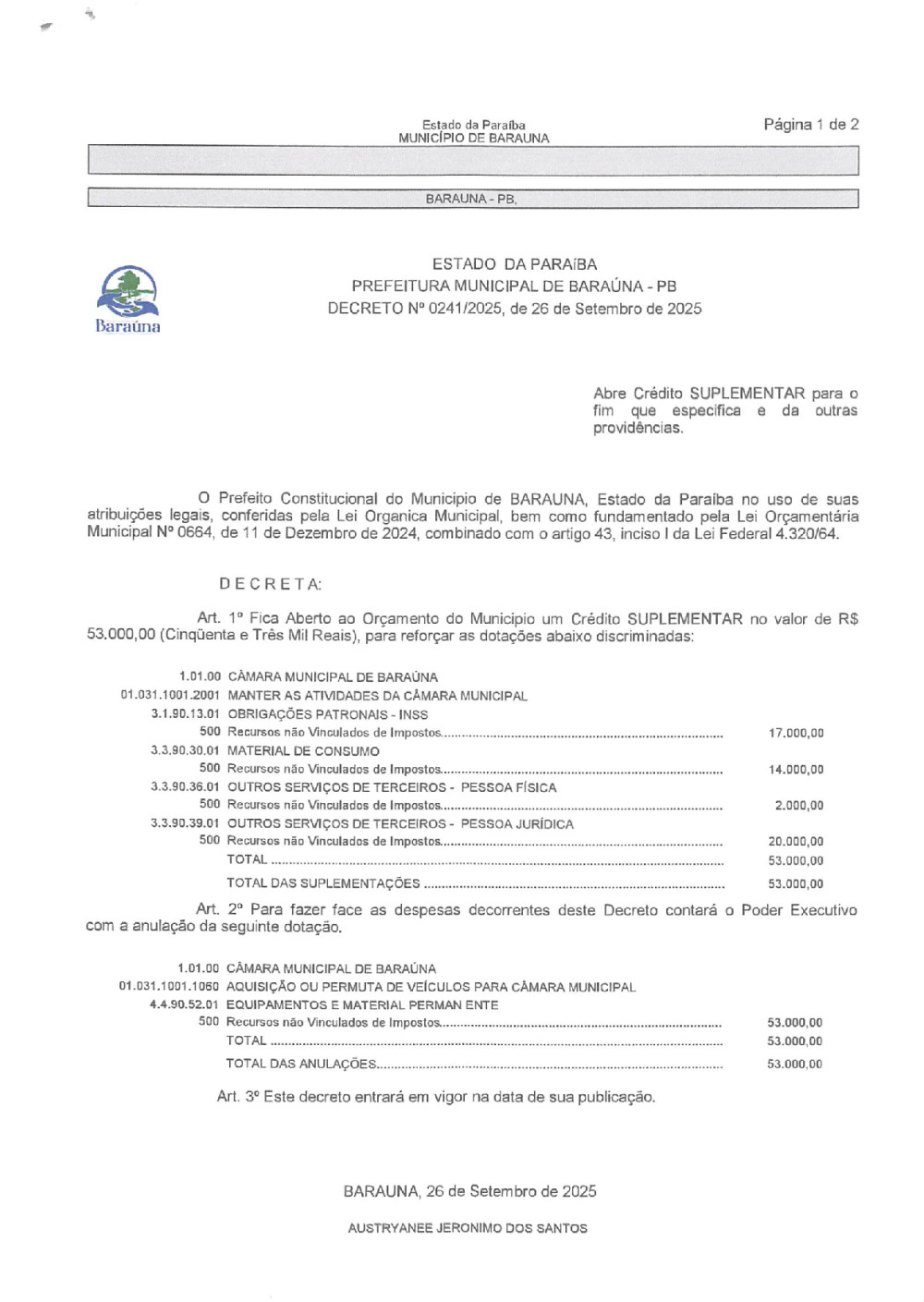 Conforme MP n° 2.200-2 de 24/08/2001, que institui a infraestrutura de chaves Públicas. Matéria Publicada no Diário Oficial do Município de Baraúna/PB no dia - Edição 01409.