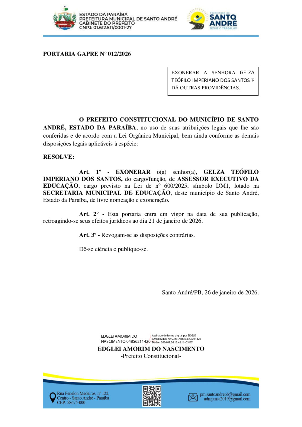 PORTARIA GAPRE Nº 012/2026 - EXONERAR A SENHORA GELZA TEÓFILO IMPERIANO DOS SANTOS E DÁ OUTRAS PROVIDÊNCIAS.