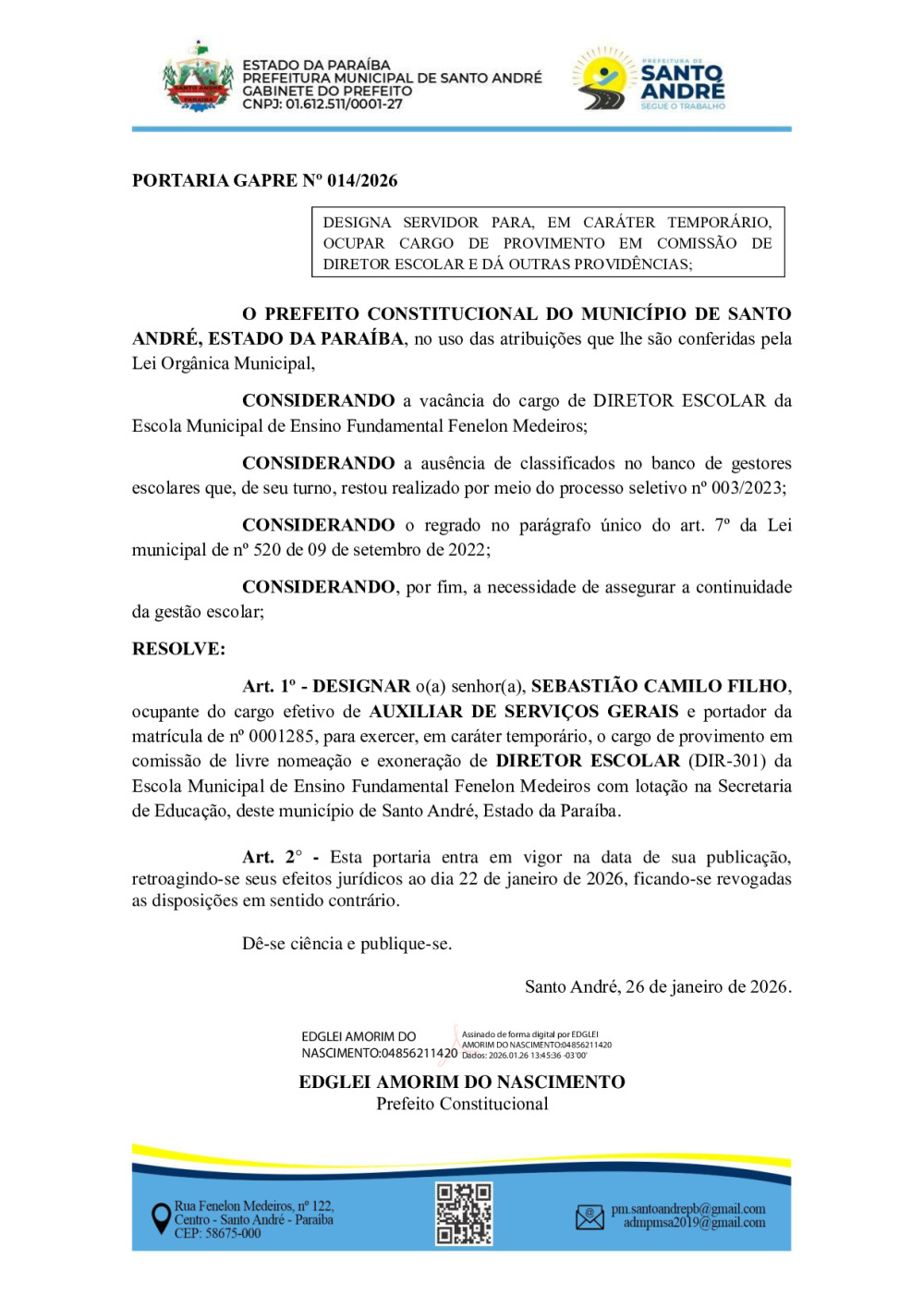 PORTARIA GAPRE Nº 014/2026 - DESIGNA SERVIDOR PARA, EM CARÁTER TEMPORÁRIO, OCUPAR CARGO DE PROVIMENTO EM COMISSÃO DE DIRETOR ESCOLAR E DÁ OUTRAS PROVIDÊNCIAS;