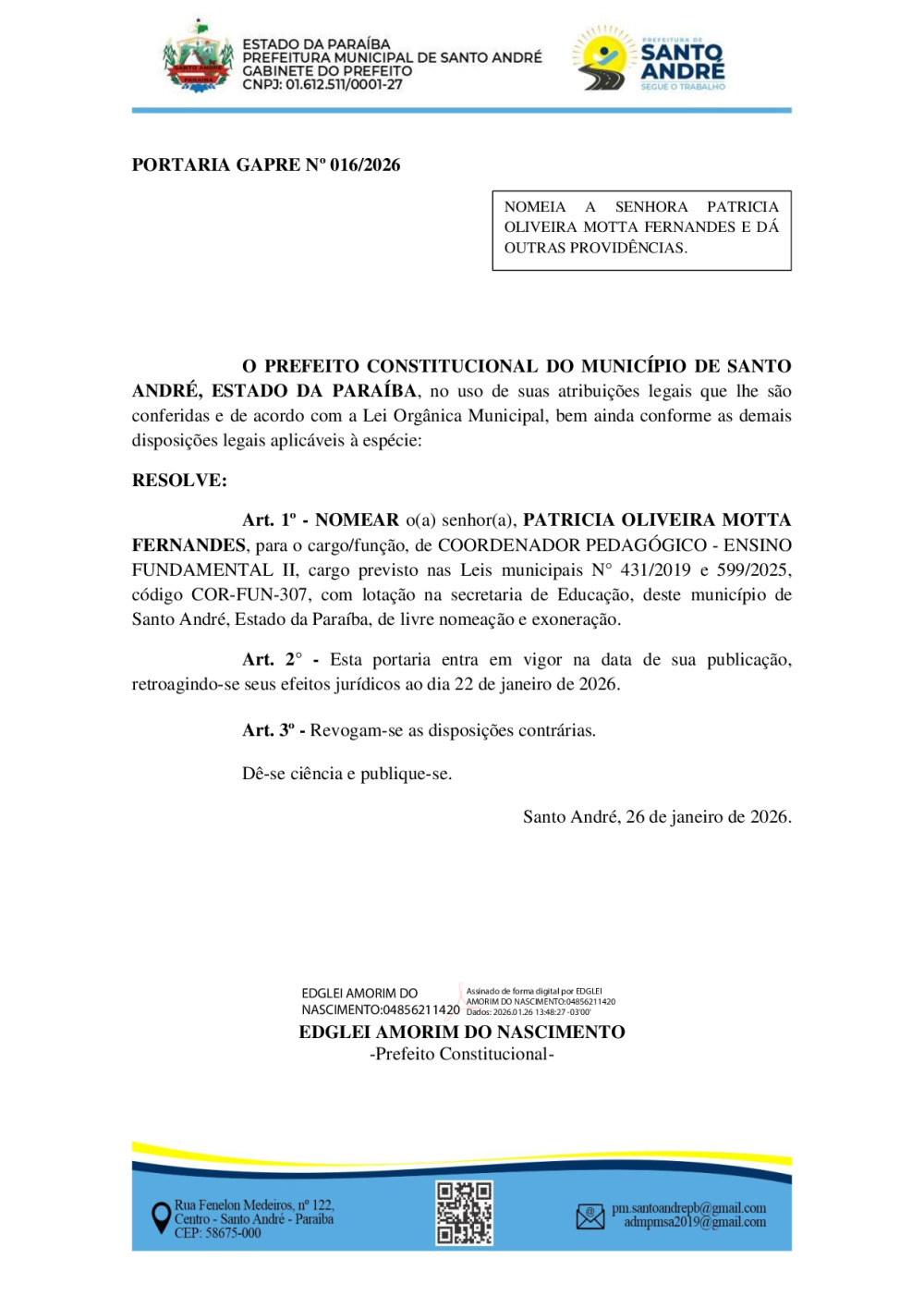Conforme MP n° 2.200-2 de 24/08/2001, que institui a infraestrutura de chaves Públicas. Matéria Publicada no Diário Oficial do Município de Santo André/PB no dia - Edição 01388.