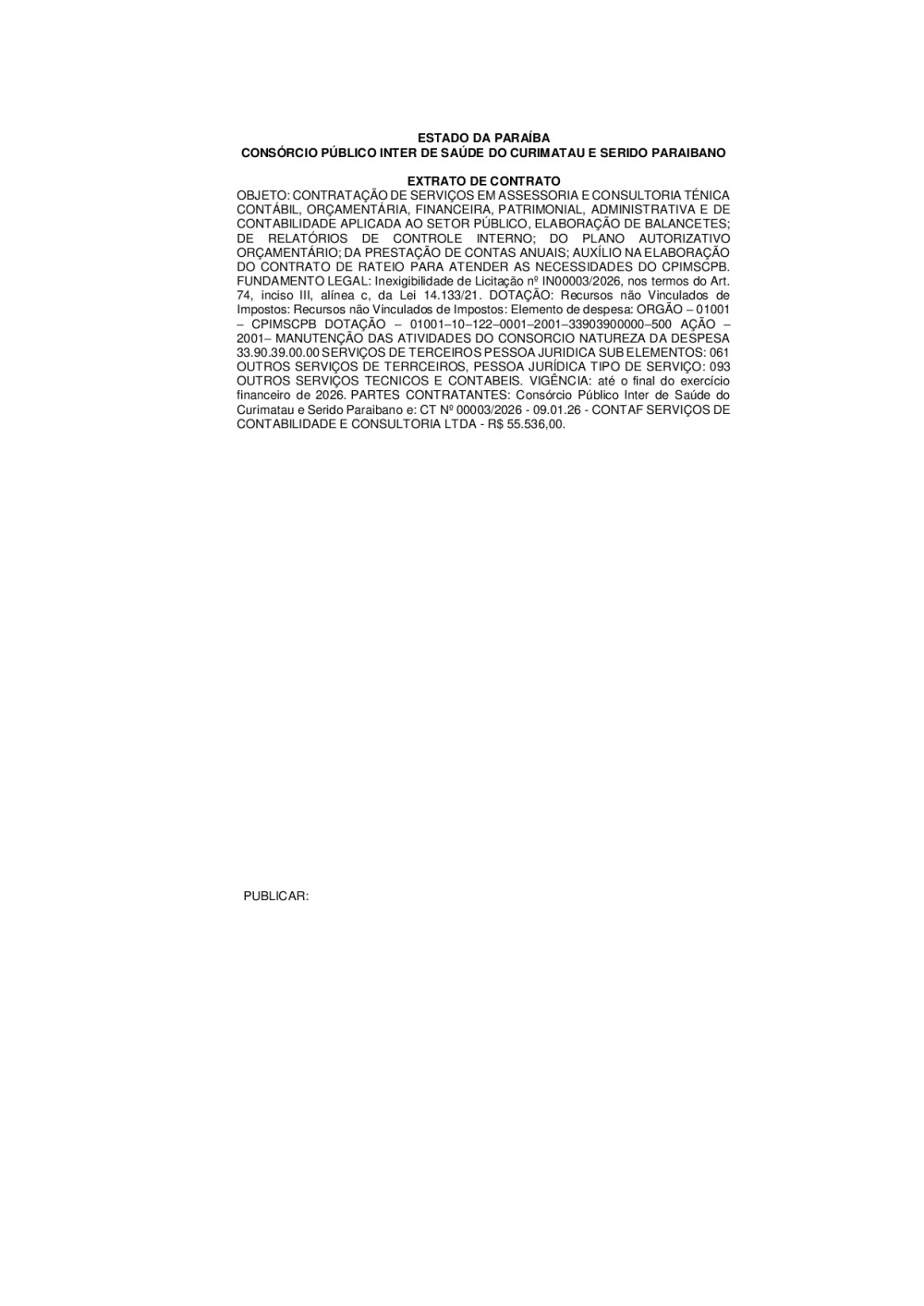EXTRATO DE CONTRATO - INEXIGIBILIDADE DE LICITAÇÃO N° IN 0003/2026