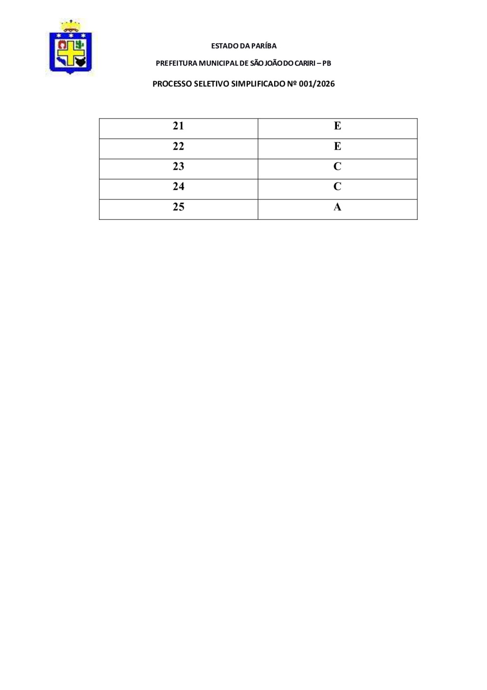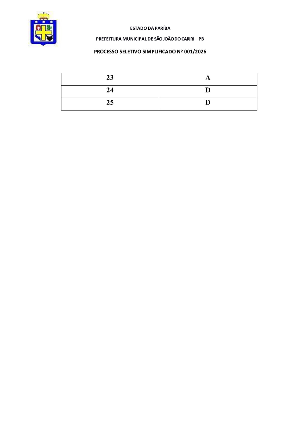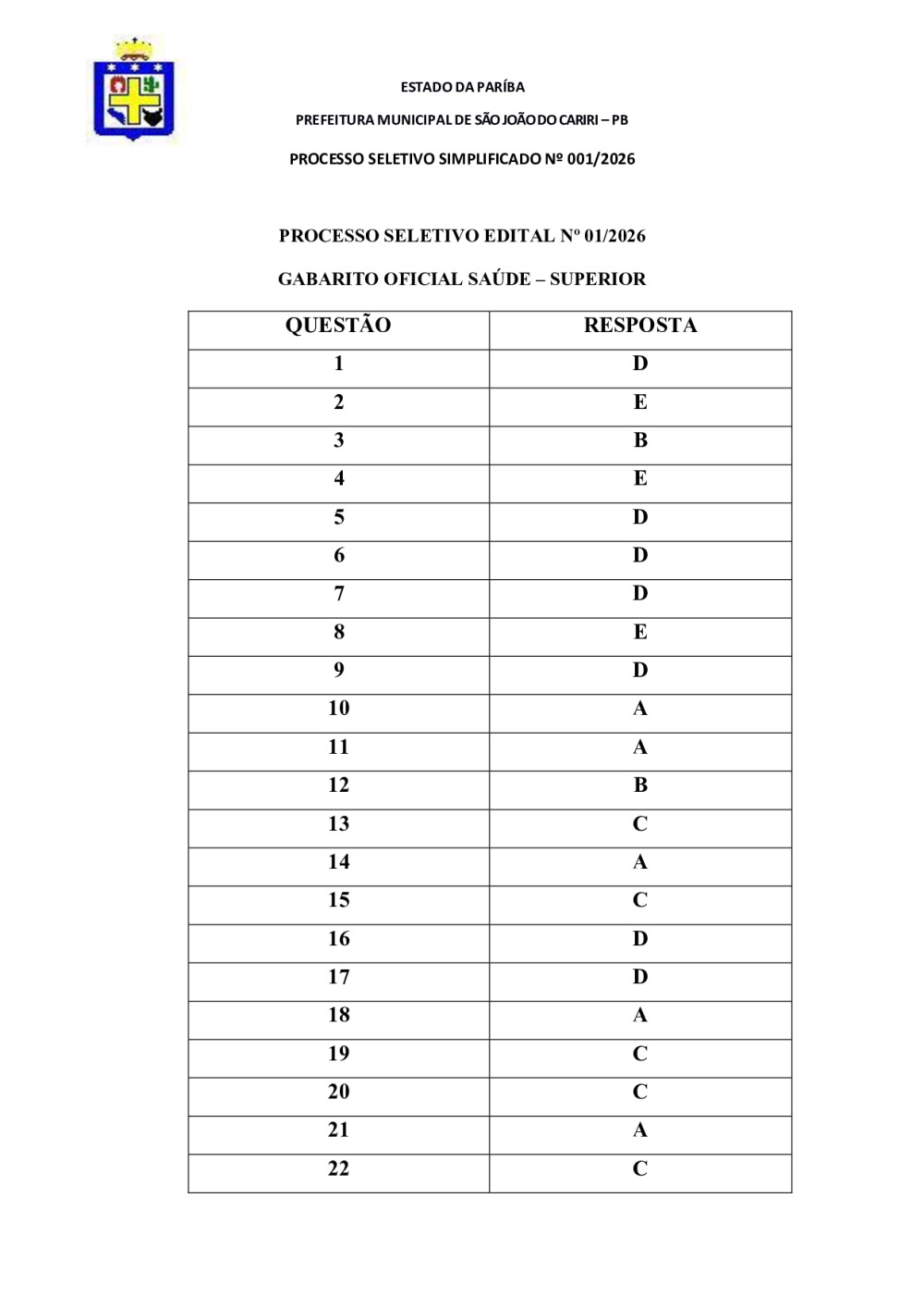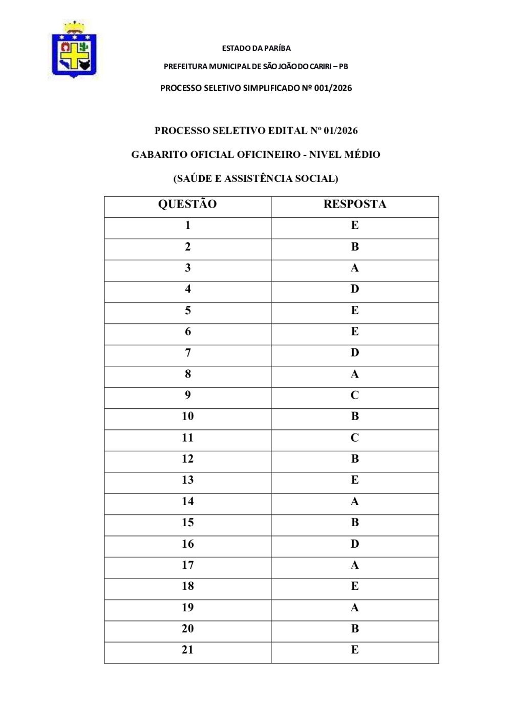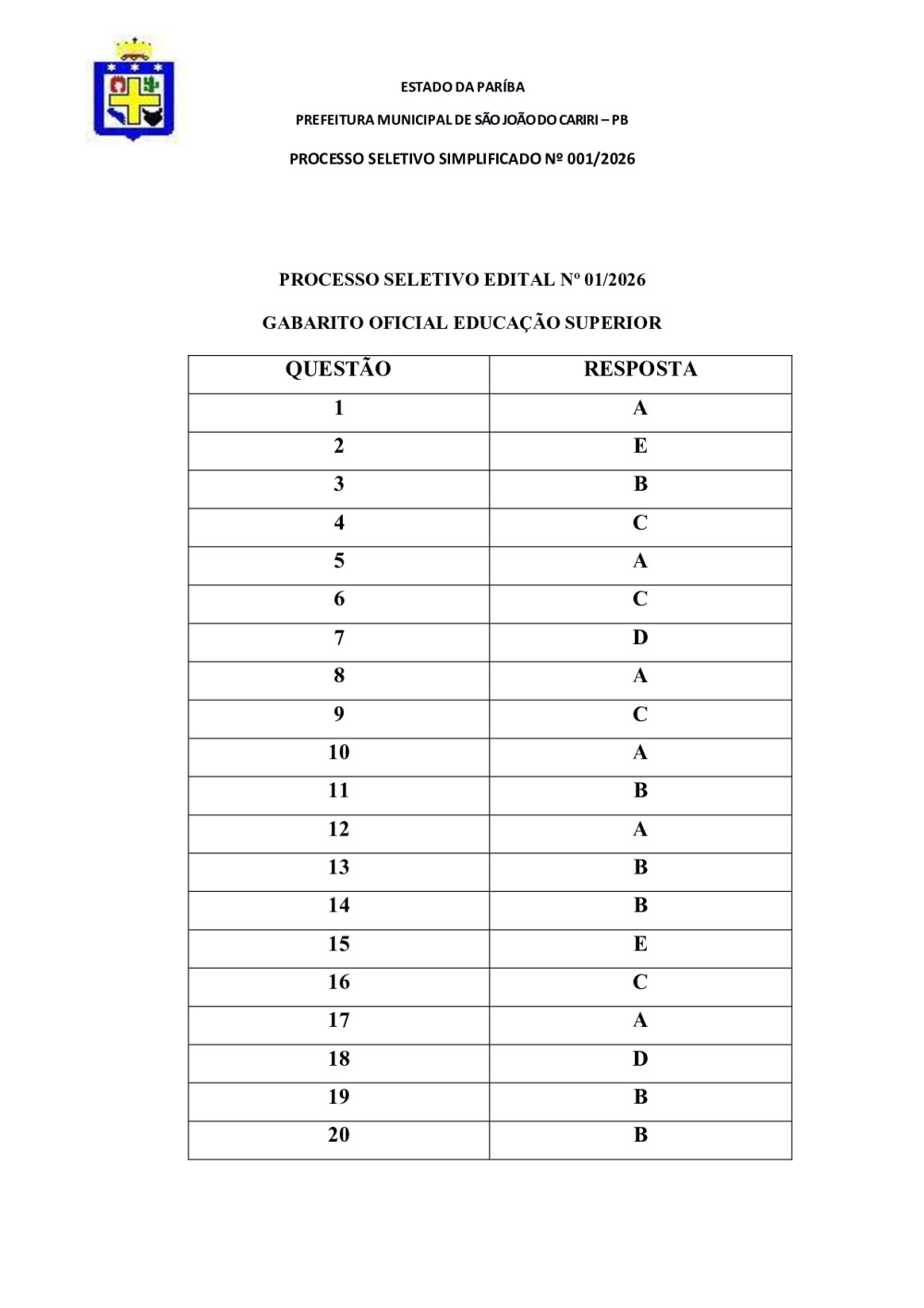 GABARITO OFICIAL - PROCESSO SELETIVO EDITAL Nº 01/2026