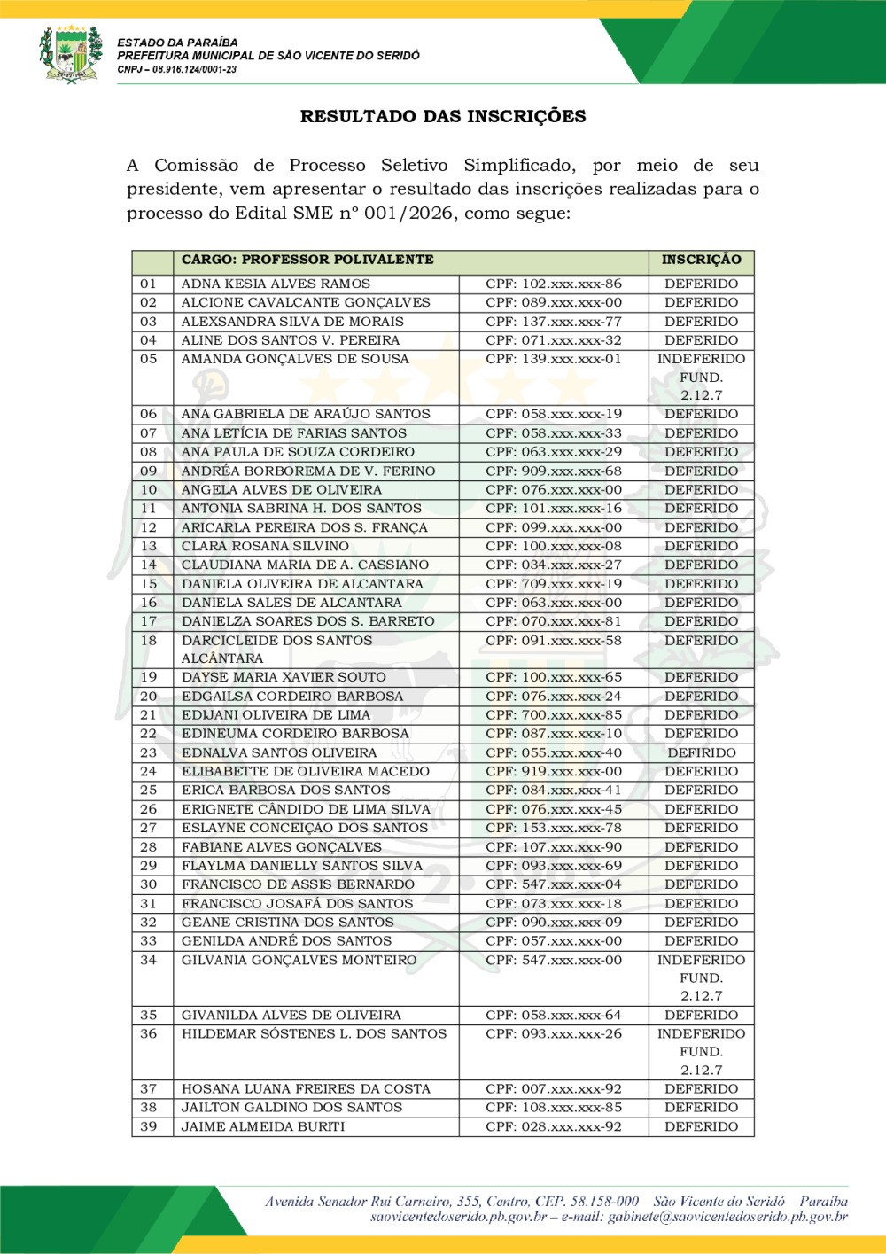 RESULTADO DAS INSCRIÇÕES - PROCESSO DO EDITAL SME Nº 001/2026