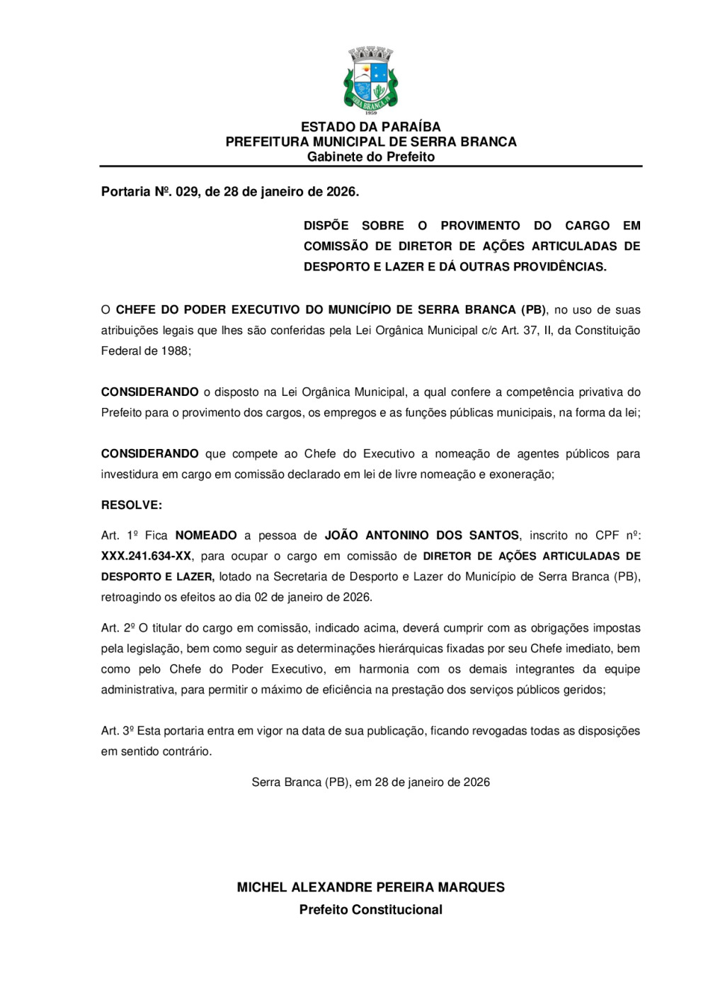 PORTARIA N° 0029/2026 - NOMEAÇÃO DE JOÃO ANTONINO DOS SANTOS