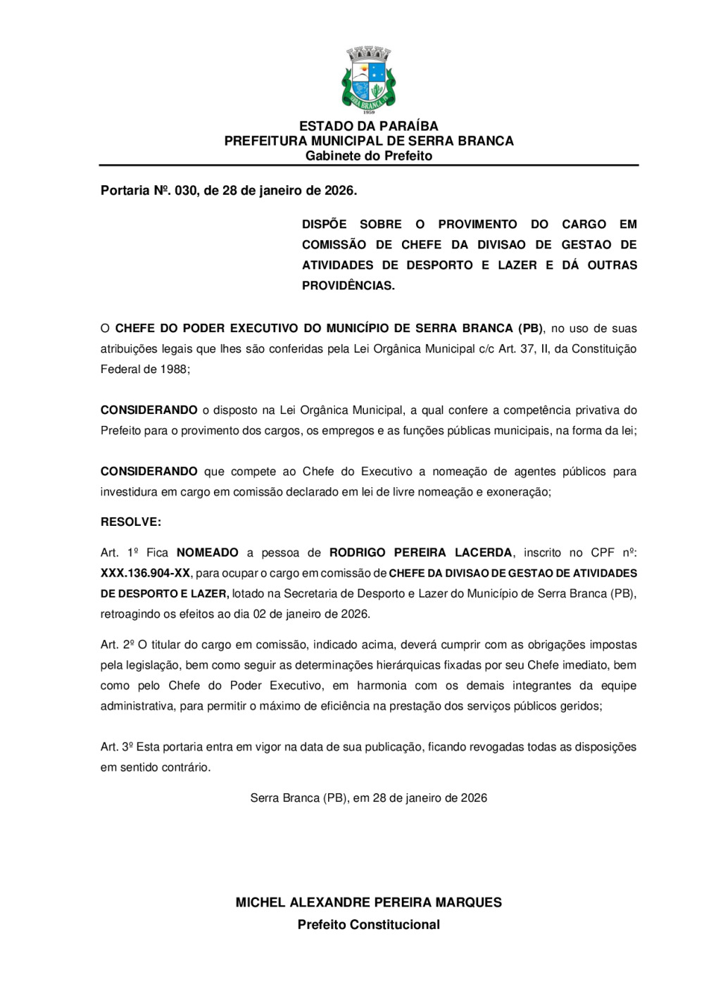PORTARIA N° 0030/2026 - NOMEAÇÃO DE RODRIGO PEREIRA LACERDA
