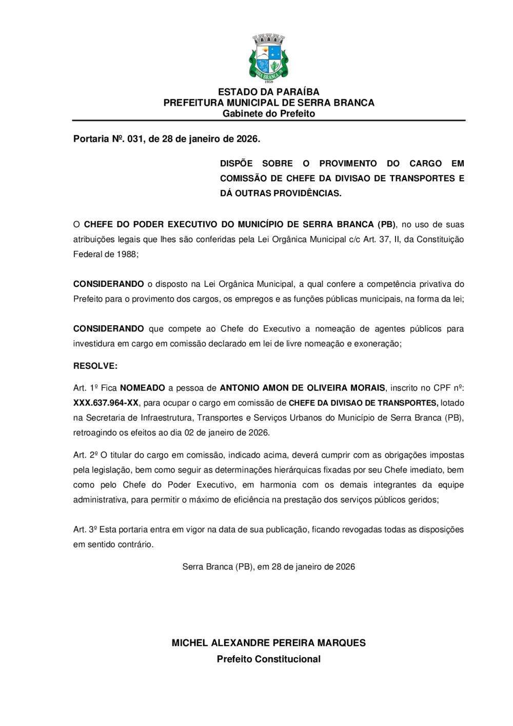 PORTARIA N° 0031/2026 - NOMEAÇÃO DE ANTONIO AMON DE OLIVEIRA MORAIS