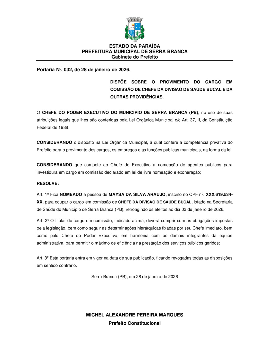 PORTARIA N° 0032/2026 - NORMAÇÃO DE MAYSA DA SILVA ARAUJO