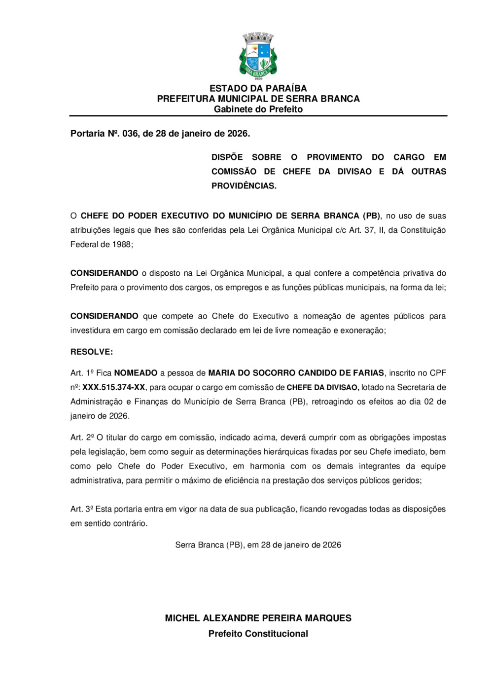 PORTARIA N° 0036/2026 - NOMEAÇÃO DE MARIA DO SOCORRO CANDIDO DE FARIAS