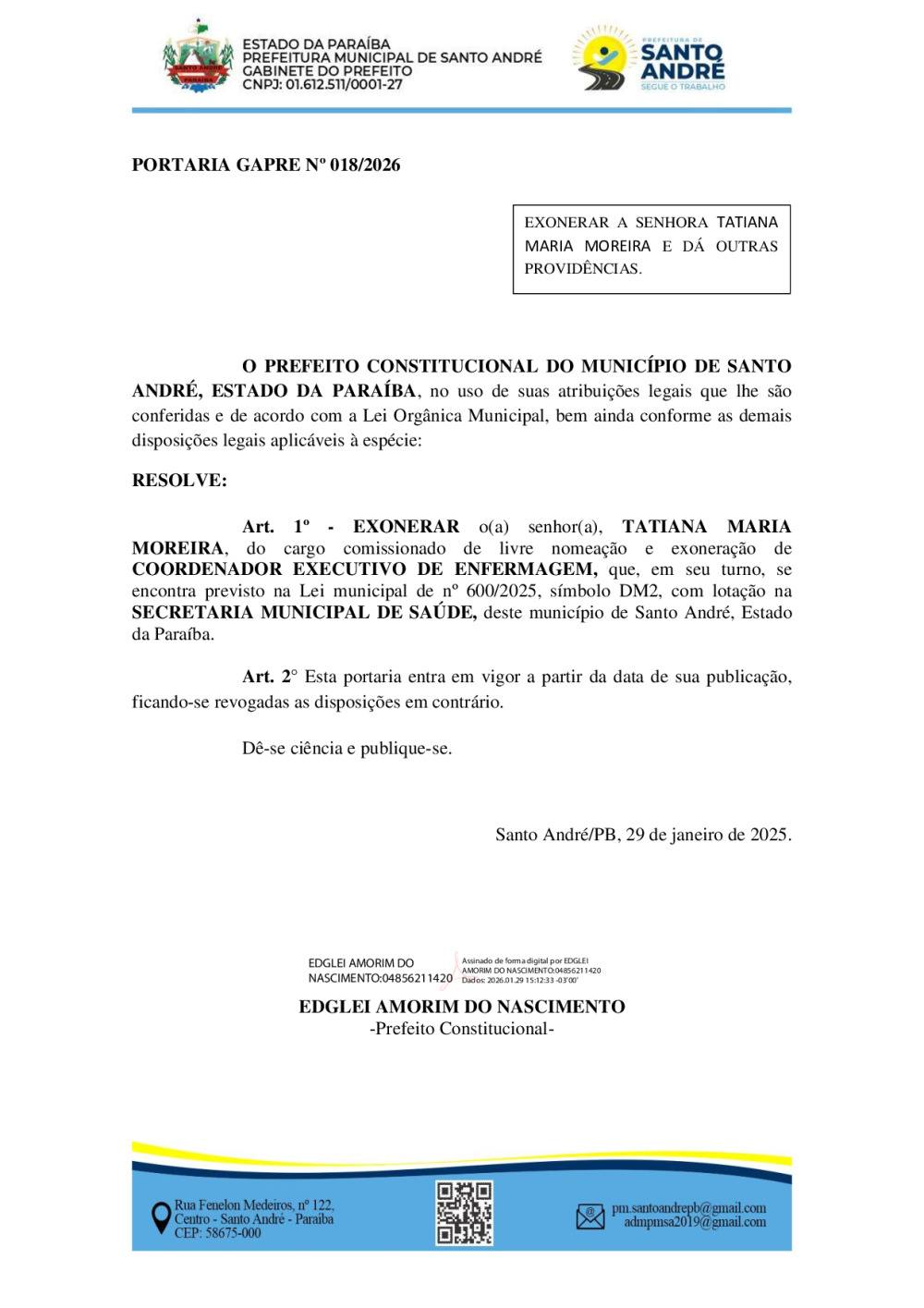PORTARIA GAPRE Nº 018/2026 - EXONERAR A SENHORA TATIANA MARIA MOREIRA E DÁ OUTRAS PROVIDÊNCIAS.