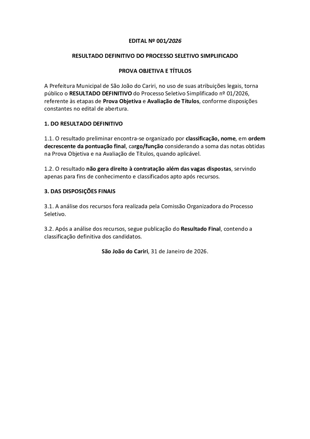 EDITAL N° 0001/2026 - RESULTADO DEFINITIVO DO PROCESSO SELETIVO SIMPLIFICADO