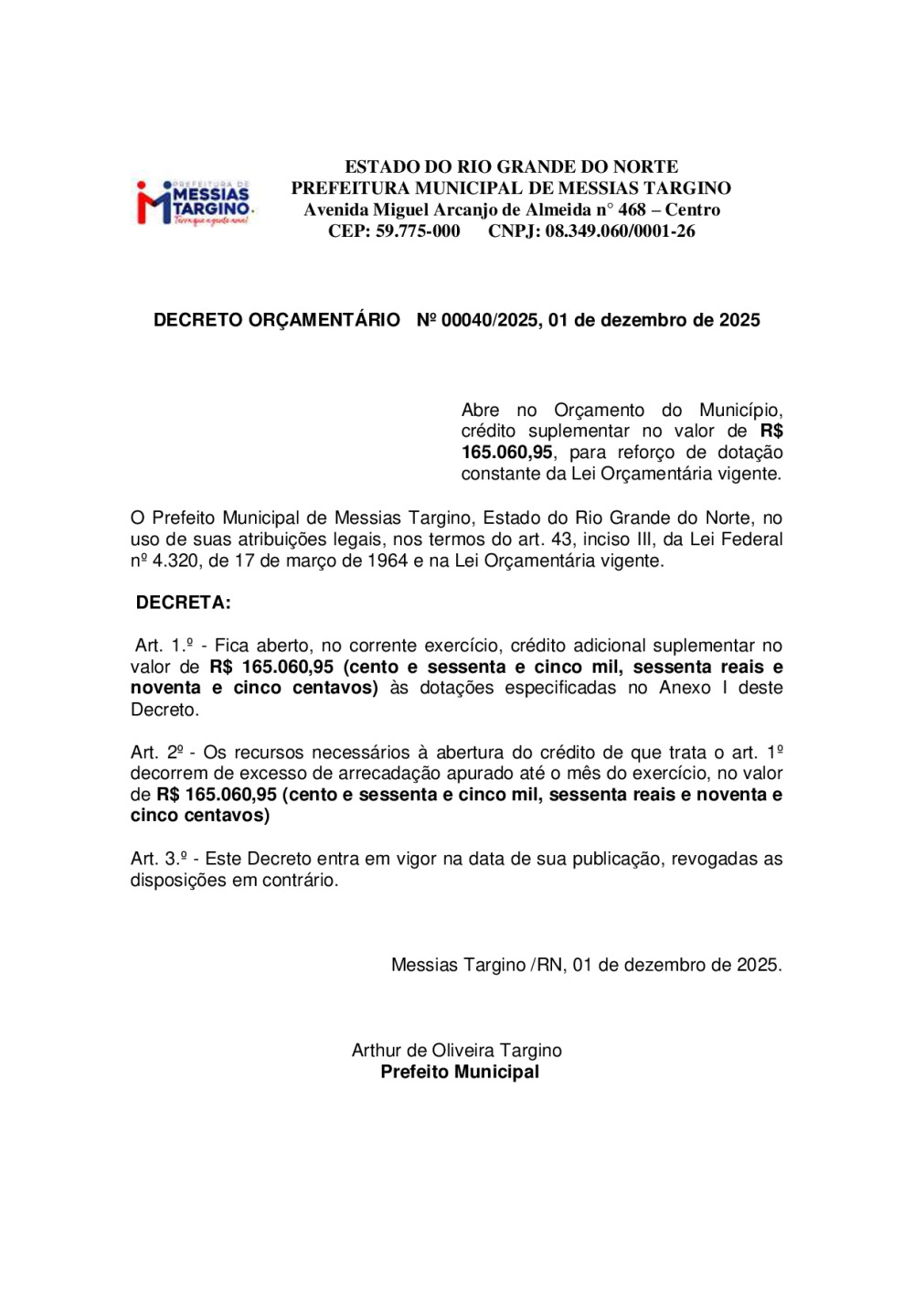 Conforme MP n° 2.200-2 de 24/08/2001, que institui a infraestrutura de chaves Públicas. Matéria Publicada no Diário Oficial do Município de Messias Targino/RN no dia - Edição 01467.