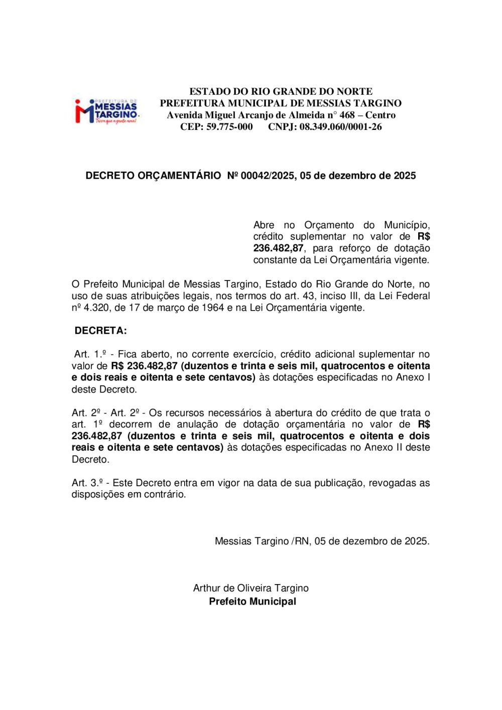 Conforme MP n° 2.200-2 de 24/08/2001, que institui a infraestrutura de chaves Públicas. Matéria Publicada no Diário Oficial do Município de Messias Targino/RN no dia - Edição 01467.