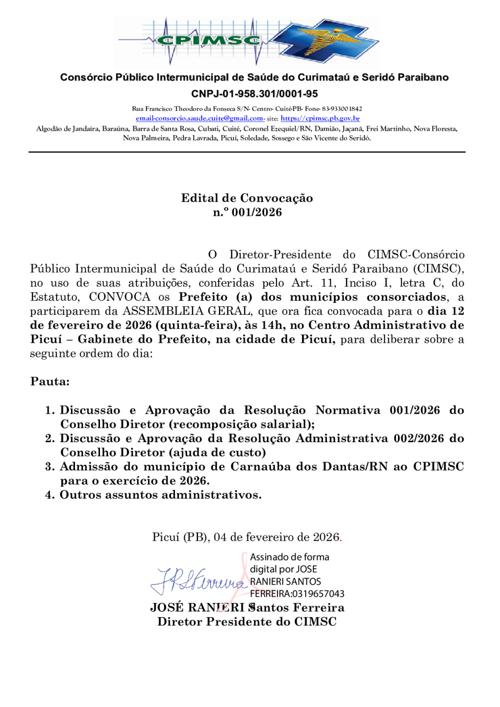 EDITAL DE CONVOCAÇÃO N° 0001/2026