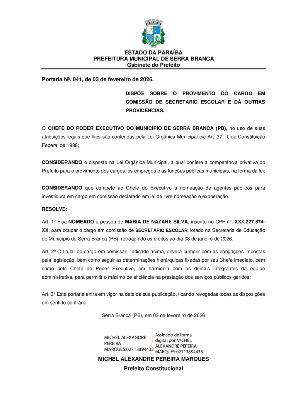 PORTARIA N° 0041/2026 - NOMEAÇÃO DE MARIA DE NAZARE SILVA