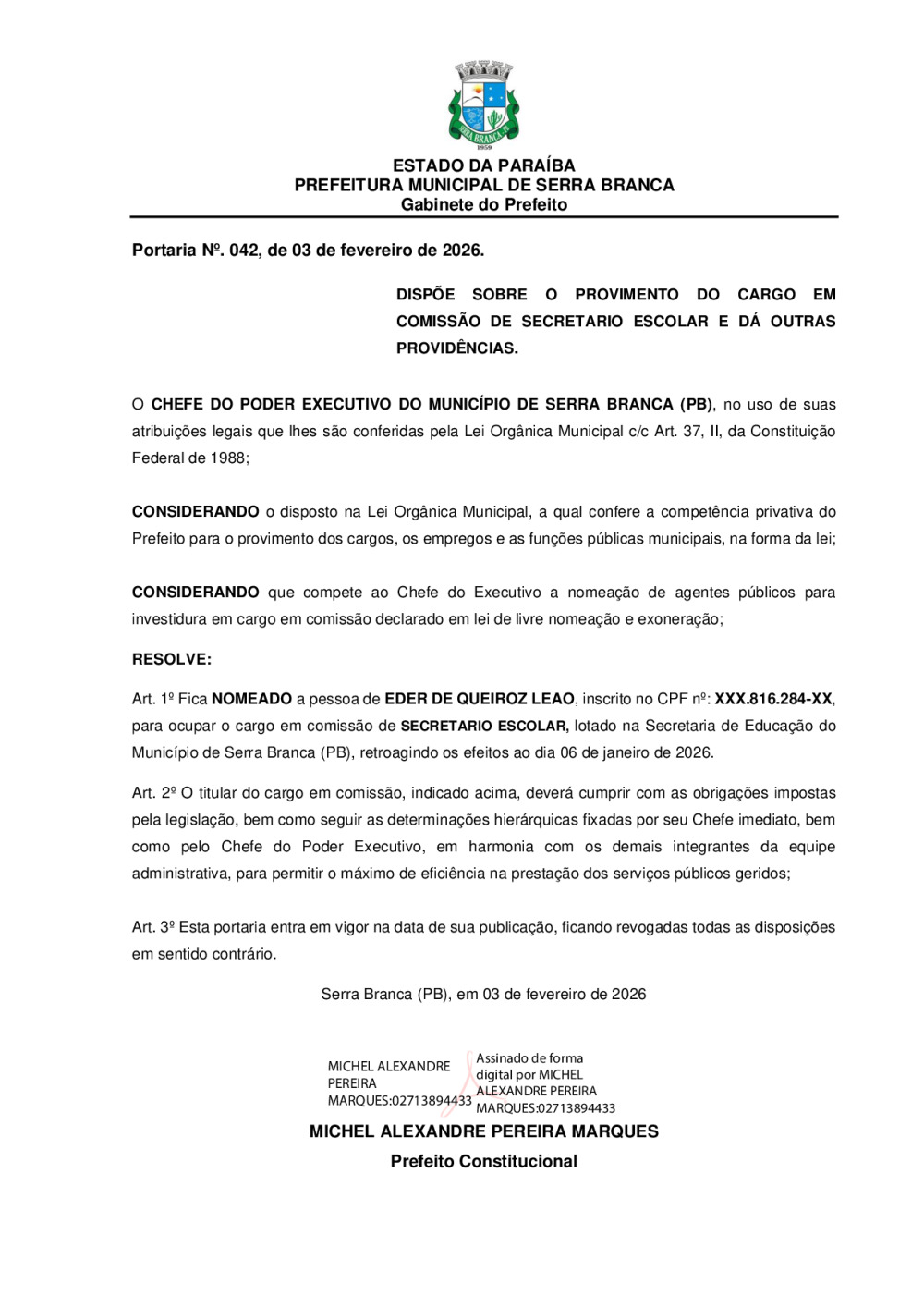 PORTARIA N° 0042/2026 - NOMEAÇÃO DE EDER DE QUEIROZ LEÃO