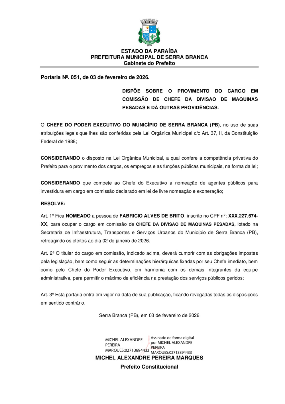 PORTARIA N° 0051/2026 - NOMEAÇÃO DE FABRICIO ALVES DE BRITO