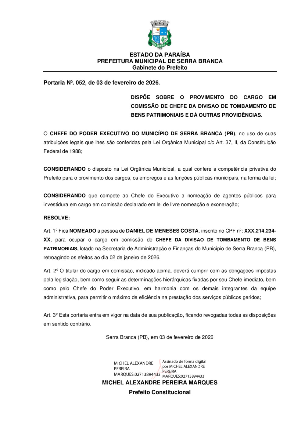 PORTARIA N° 0052/2026 - NOMEAÇÃO DE DANIEL DE MENESES COSTA
