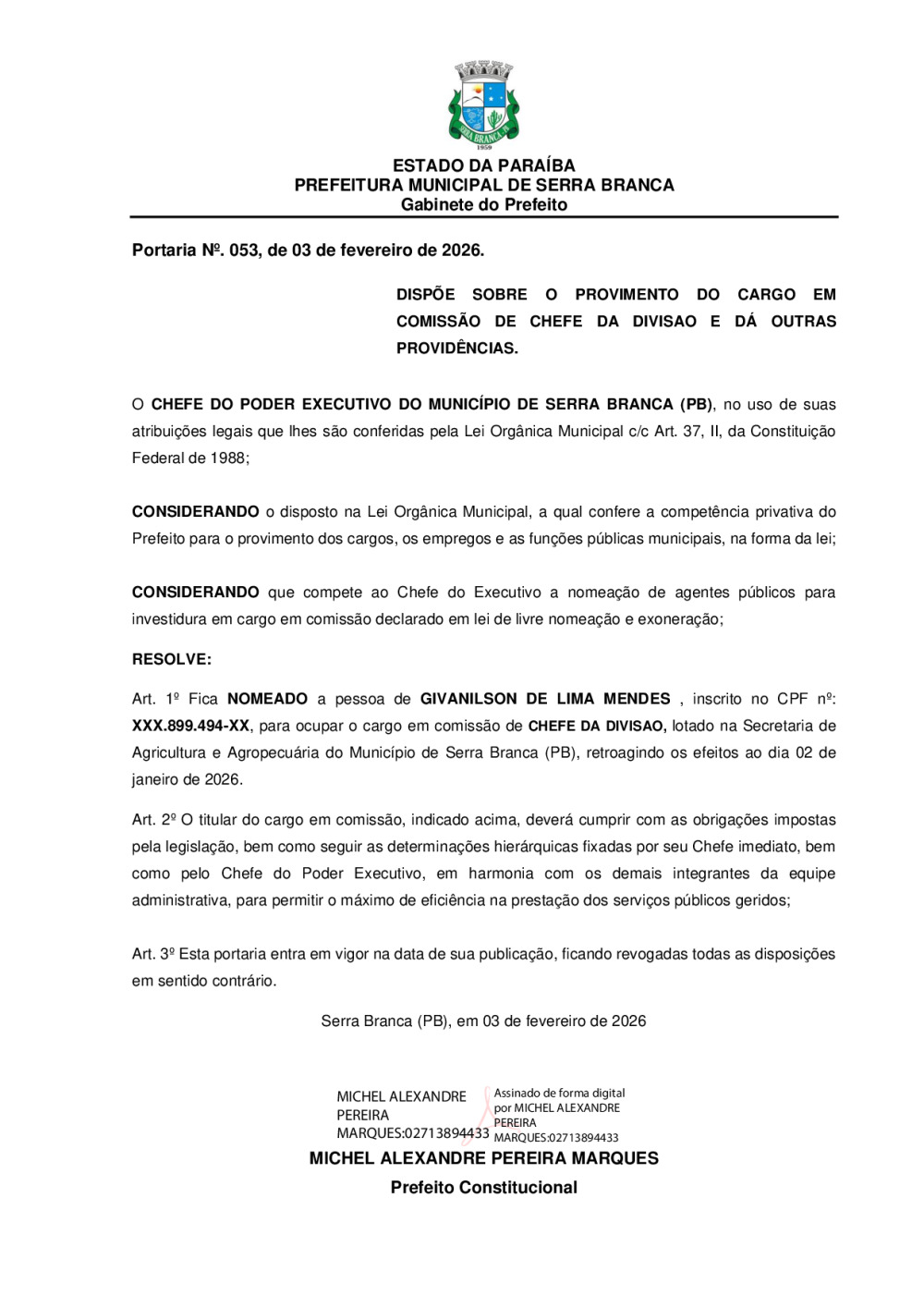 PORTARIA N° 0053/2026 - NOMEAÇÃO DE GIVANILSON DE LIMA MENDES