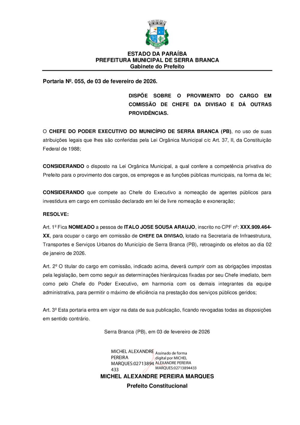 PORTARIA N° 0055/2026 - NOMEAÇÃO DE ITALO JOSE SOUSA ARAUJO