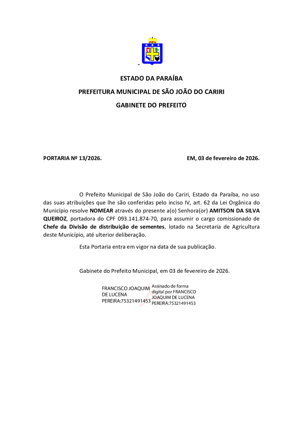 Conforme MP n° 2.200-2 de 24/08/2001, que institui a infraestrutura de chaves Públicas. Matéria Publicada no Diário Oficial do Município de São João do Cariri/PB no dia - Edição 01915.
