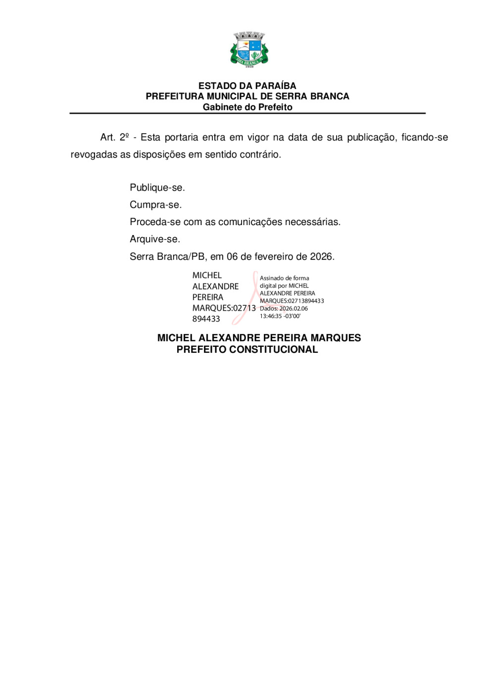 Conforme MP n° 2.200-2 de 24/08/2001, que institui a infraestrutura de chaves Públicas. Matéria Publicada no Diário Oficial do Município de Serra Branca/PB no dia - Edição 00272.