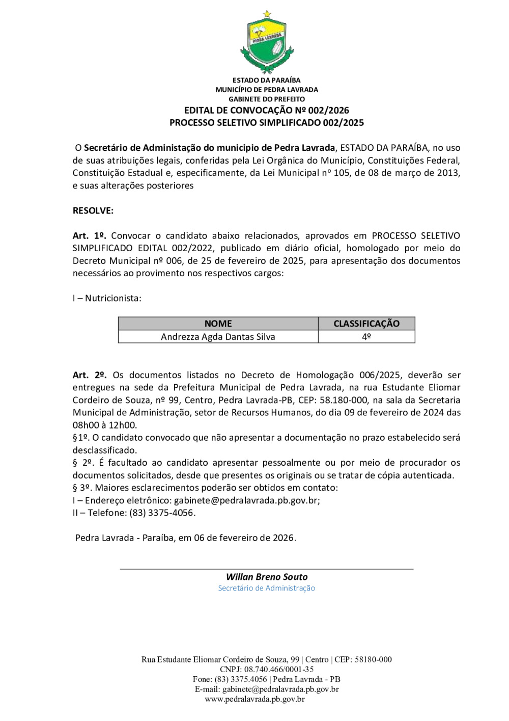 EDITAL DE CONVOCAÇÃO N° 002/2026 - PROCESSO SELETIVO SIMPLIFICADO 0002/2025