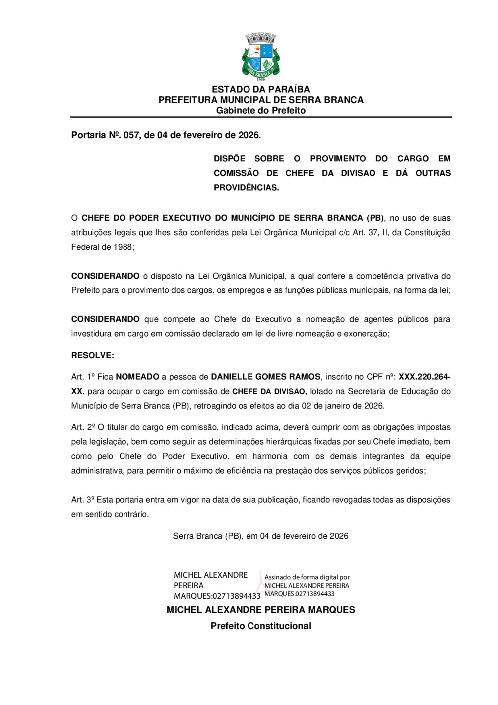 PORTARIA N° 0057/2026 - NOMEAÇÃO DE DANIELLE GOMES RAMOS