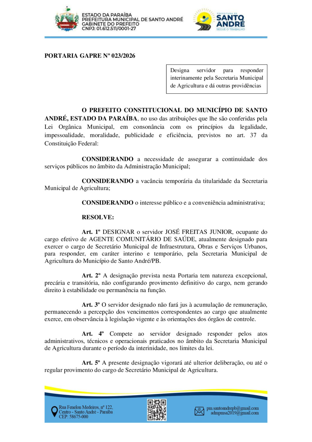 PORTARIA GAPRE Nº 023/2026 - DESIGNA SERVIDOR PARA RESPONDER INTERINAMENTE PELA SECRETARIA MUNICIPAL DE AGRICULTURA E DÁ OUTRAS PROVIDÊNCIAS