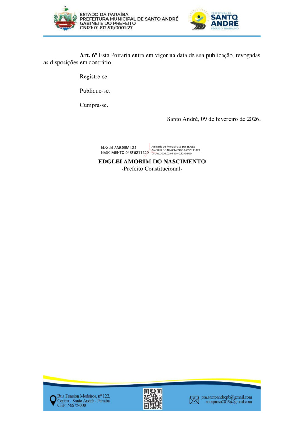 Conforme MP n° 2.200-2 de 24/08/2001, que institui a infraestrutura de chaves Públicas. Matéria Publicada no Diário Oficial do Município de Santo André/PB no dia - Edição 01398.