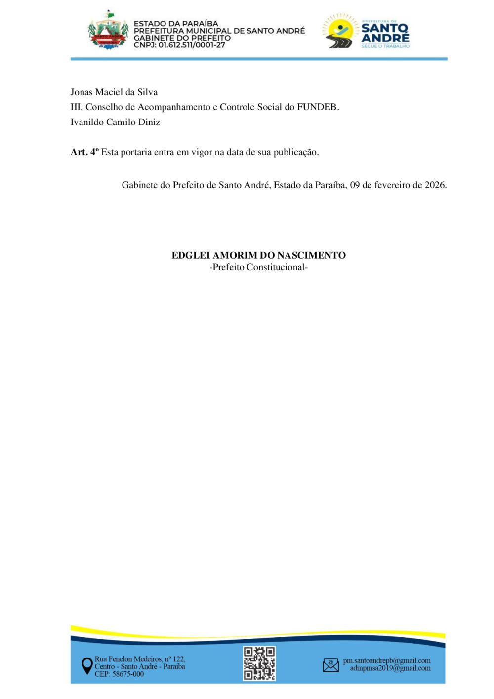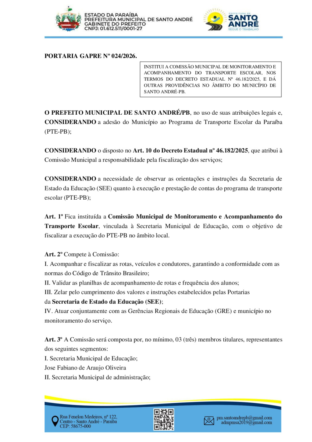 PORTARIA GAPRE Nº 024/2026 - INSTITUI A COMISSÃO MUNICIPAL DE MONITORAMENTO E ACOMPANHAMENTO DO TRANSPORTE ESCOLAR, NOS TERMOS DO DECRETO ESTADUAL Nº 46.182/2025, E DÁ OUTRAS PROVIDÊNCIAS NO ÂMBITO DO MUNICÍPIO DE SANTO ANDRÉ-PB.
