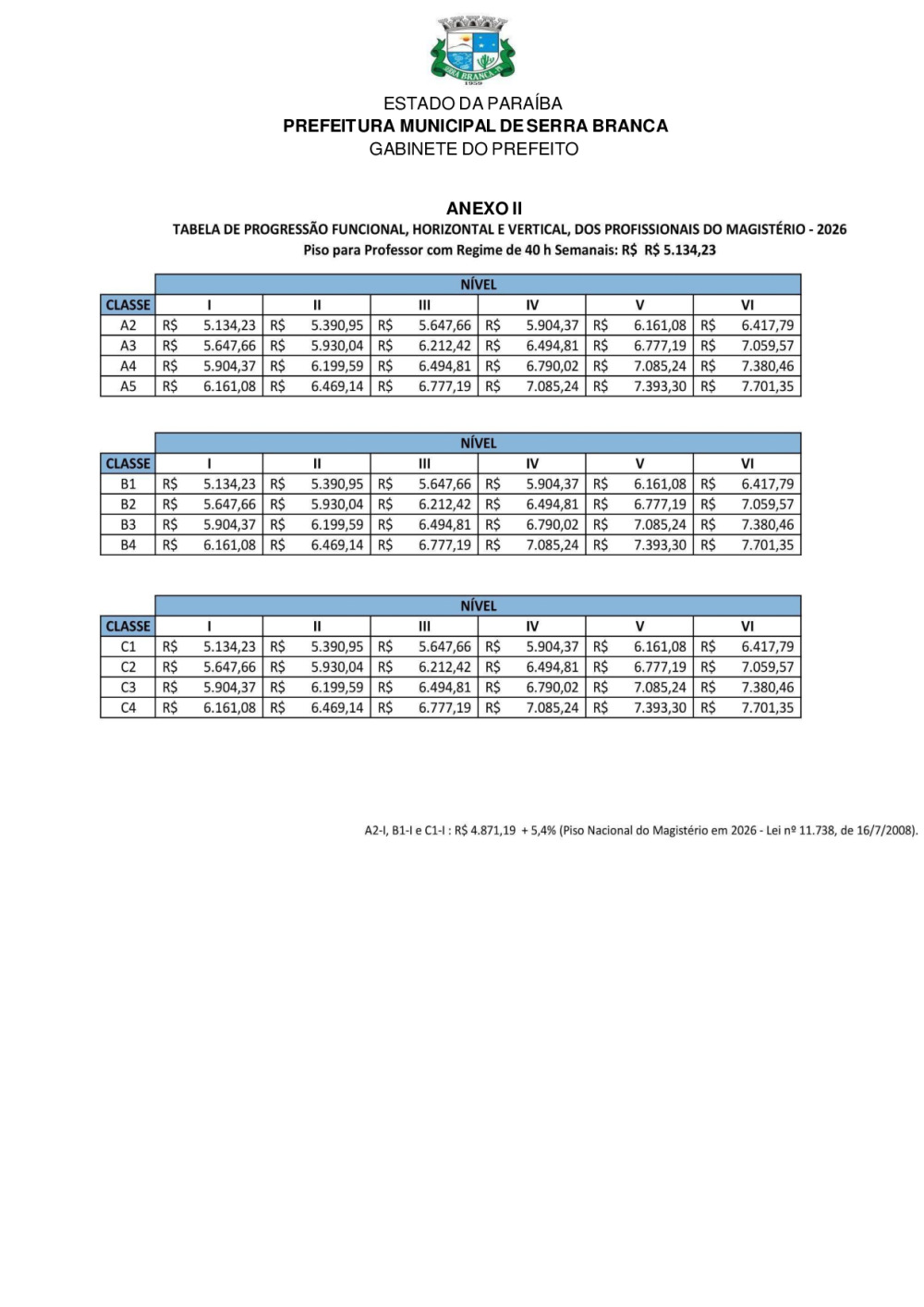 RETIFICAÇÃO - LEI N° 1117/2026 - ATUALIZA OS VENCIMENTOS DOS ANEXOS I E II DA LEI N° 600, DE 02/04/2012, CUJO TEOR DIZ RESPEITO A IMPLANTAÇÃO DO PLANO DE CARGOS, CARREIRA E REMUNERAÇÃO DO MAGISTÉRIO PÚBLICO MUNICIPAL DE SERRA BRANCA/PB