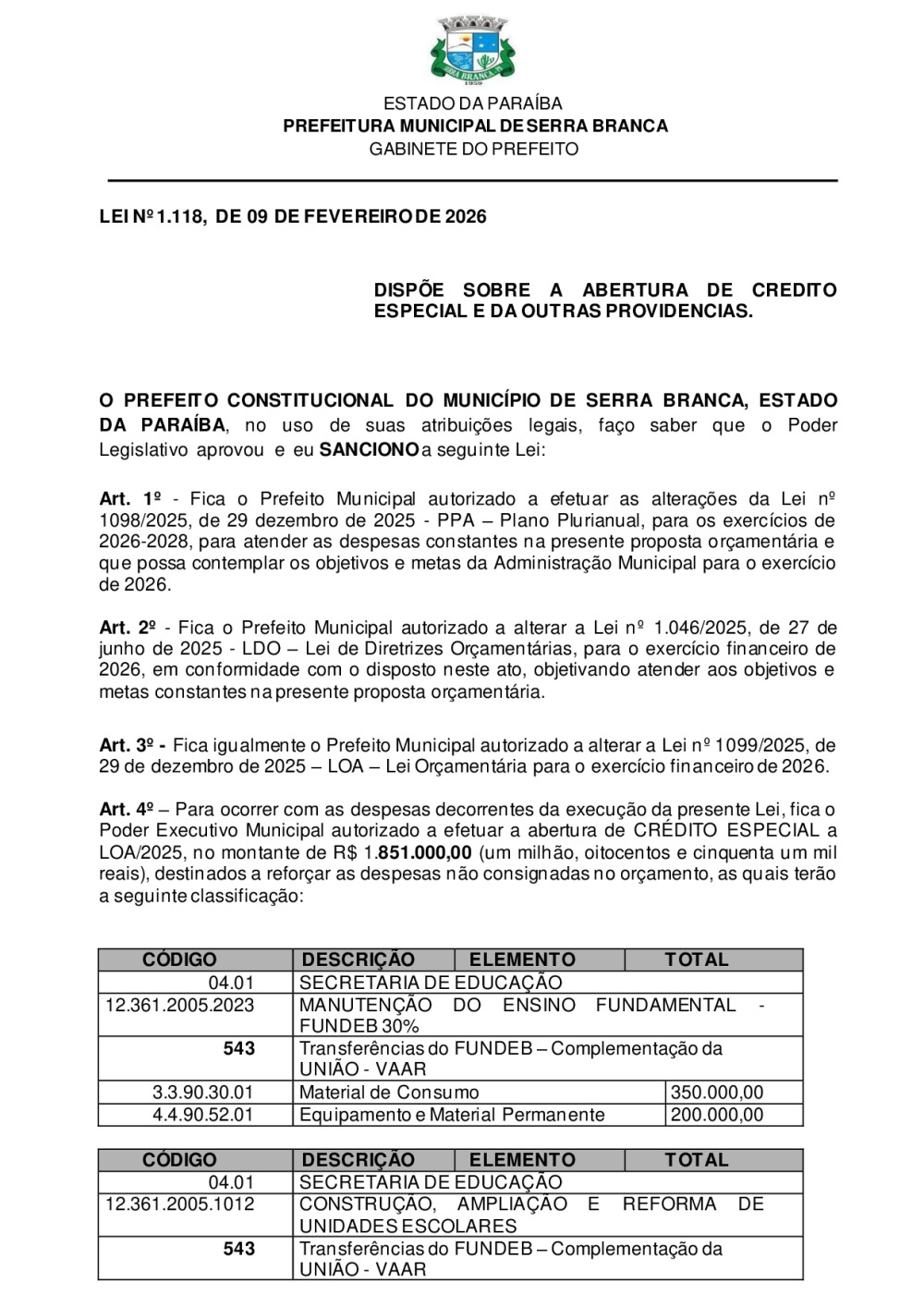 RETIFICAÇÃO - LEI N° 1118/2026 - DISPÕE SOBRE A ABERTURA DE CREDITO ESPECIAL