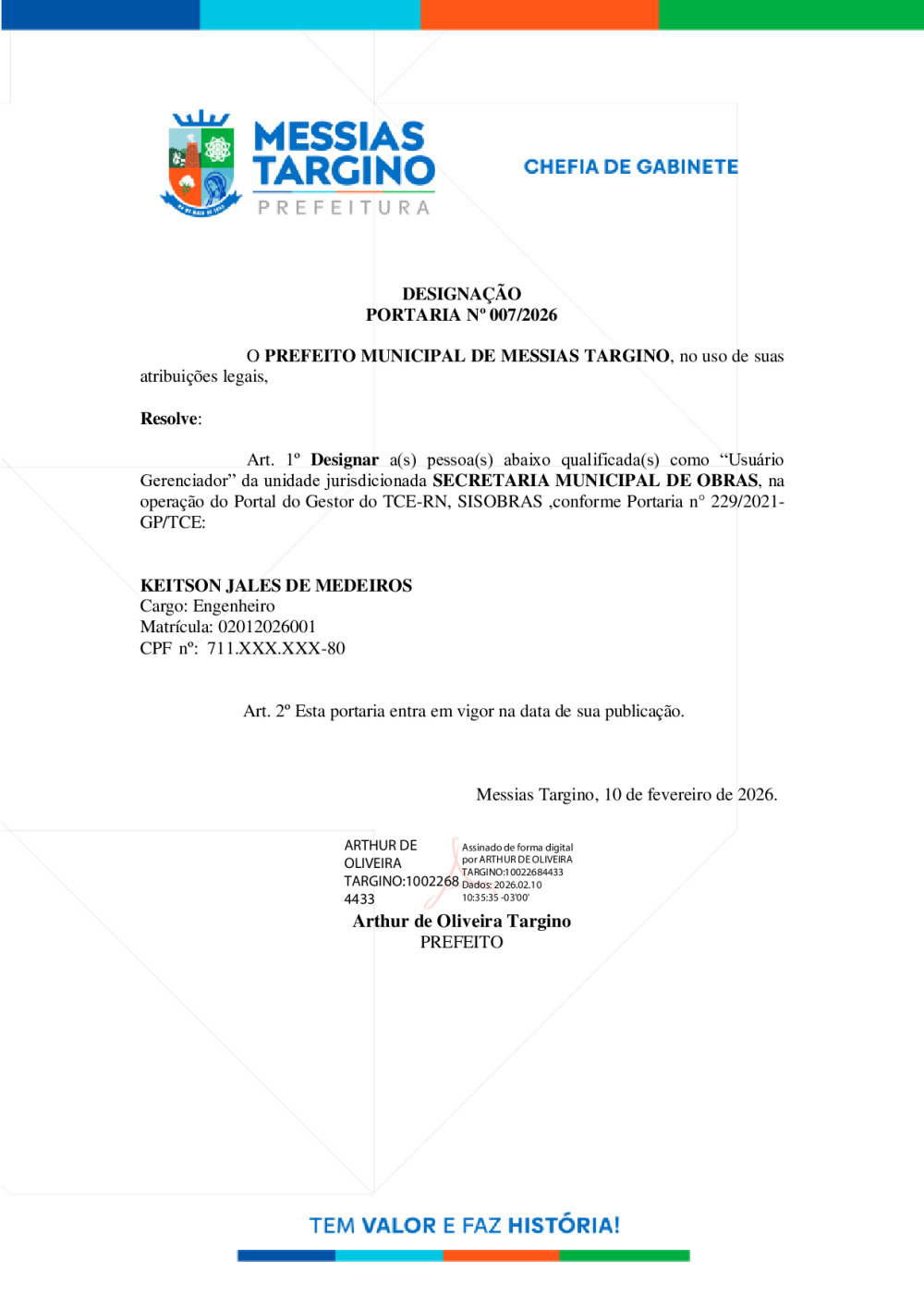 Conforme MP n° 2.200-2 de 24/08/2001, que institui a infraestrutura de chaves Públicas. Matéria Publicada no Diário Oficial do Município de Messias Targino/RN no dia - Edição 01472.