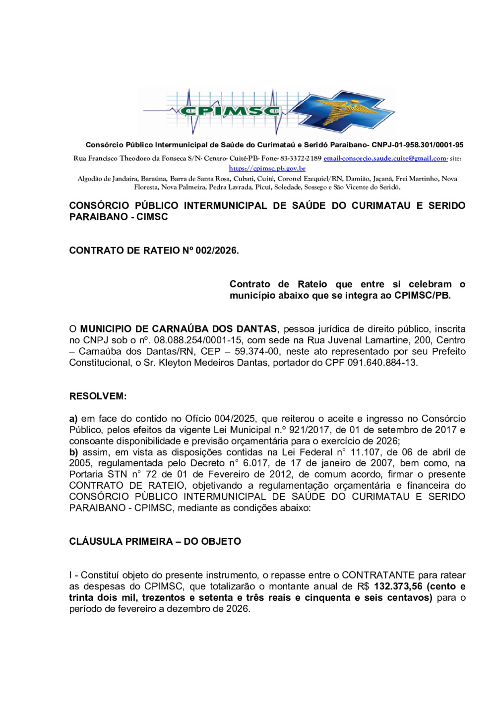 CONTRATO DE RATEIO N° 0002/2026 - ONTRATO DE RATEIO QUE ENTRE SI CELEBRAM O MUNICÍPIO ABAIXO QUE SE INTEGRA AO CPIMSC/PB