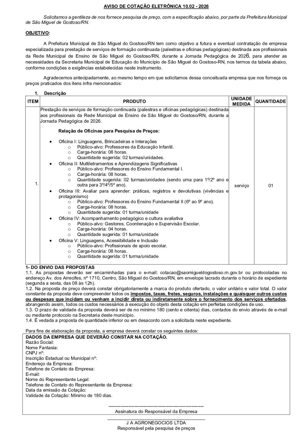 AVISO DE COTAÇÃO ELETRÔNICA 10.02 - 2026