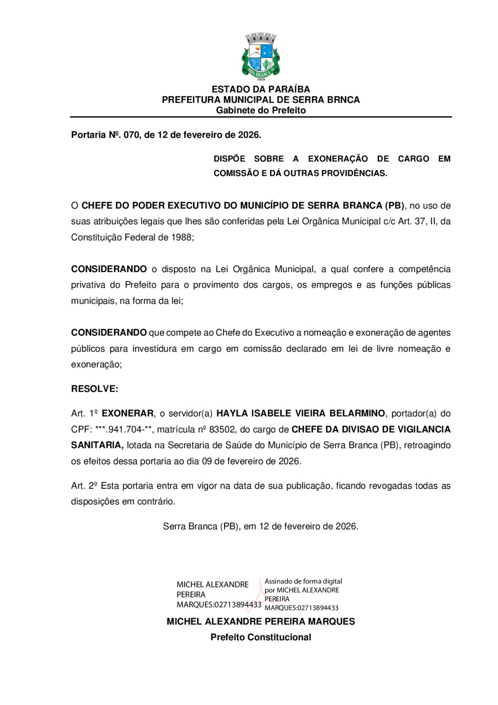 PORTARIA N° 0070/2026 - EXONERAÇÃO DE HAYLA ISABELE VIEIRA BELARMINO