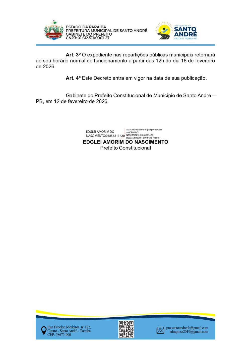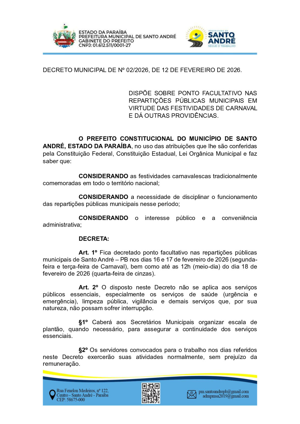 DECRETO MUNICIPAL DE Nº 02/2026, DE 12 DE FEVEREIRO DE 2026 - DISPÕE SOBRE PONTO FACULTATIVO NAS REPARTIÇÕES PÚBLICAS MUNICIPAIS EM VIRTUDE DAS FESTIVIDADES DE CARNAVAL E DÁ OUTRAS PROVIDÊNCIAS