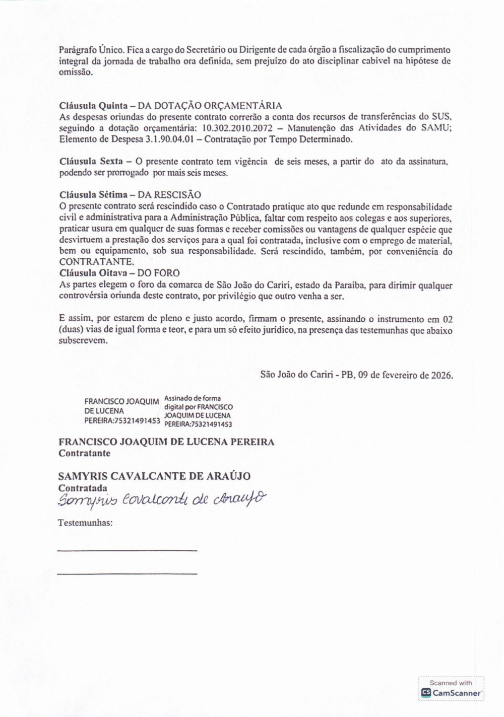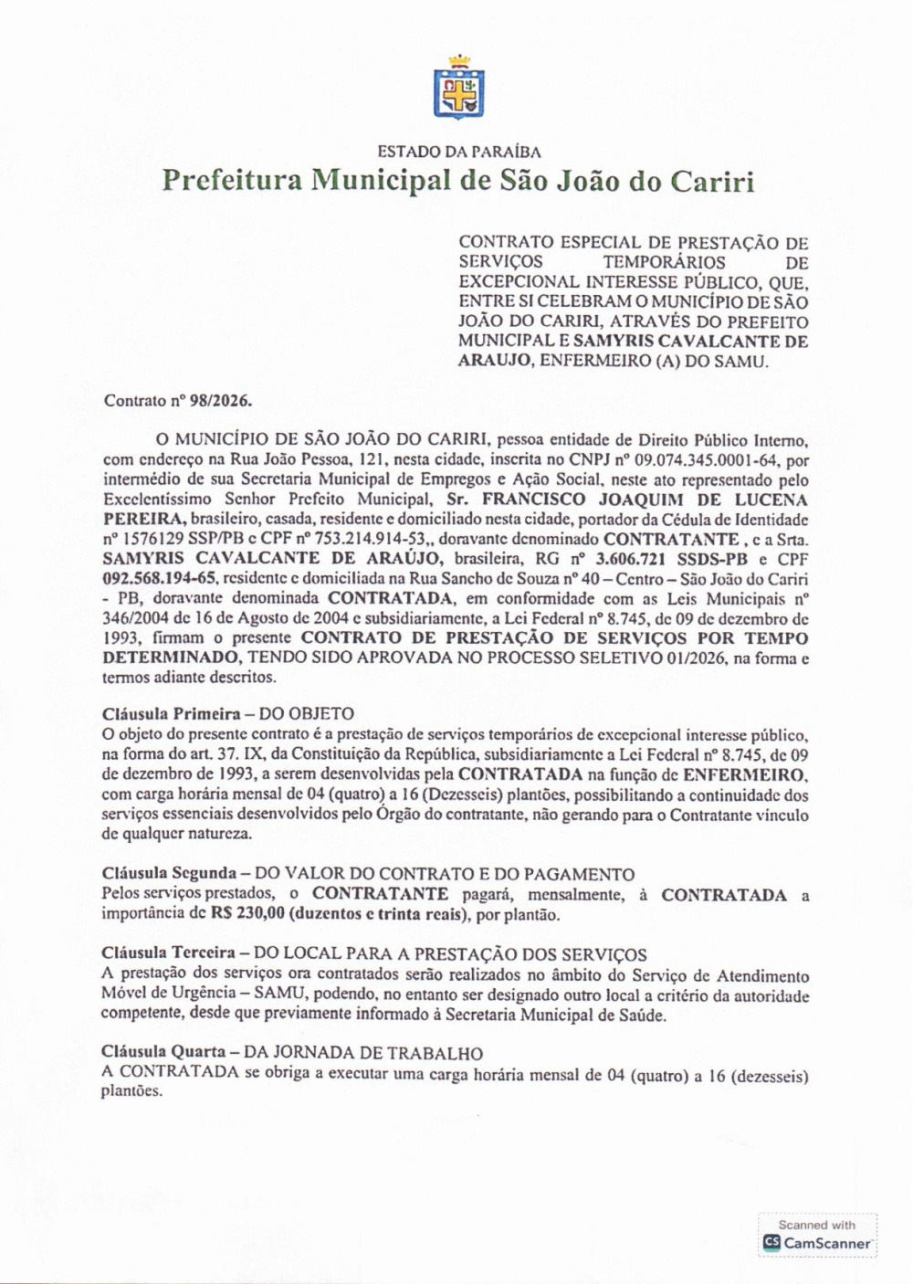 CONTRATO 98/2026 - SAMYRIS CAVALCANTE DE ARAUJO
