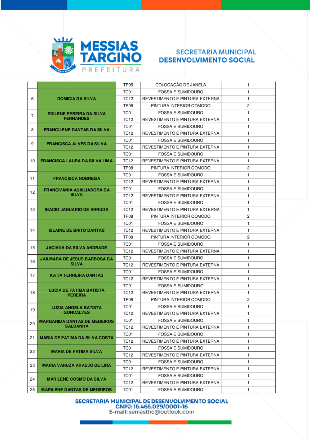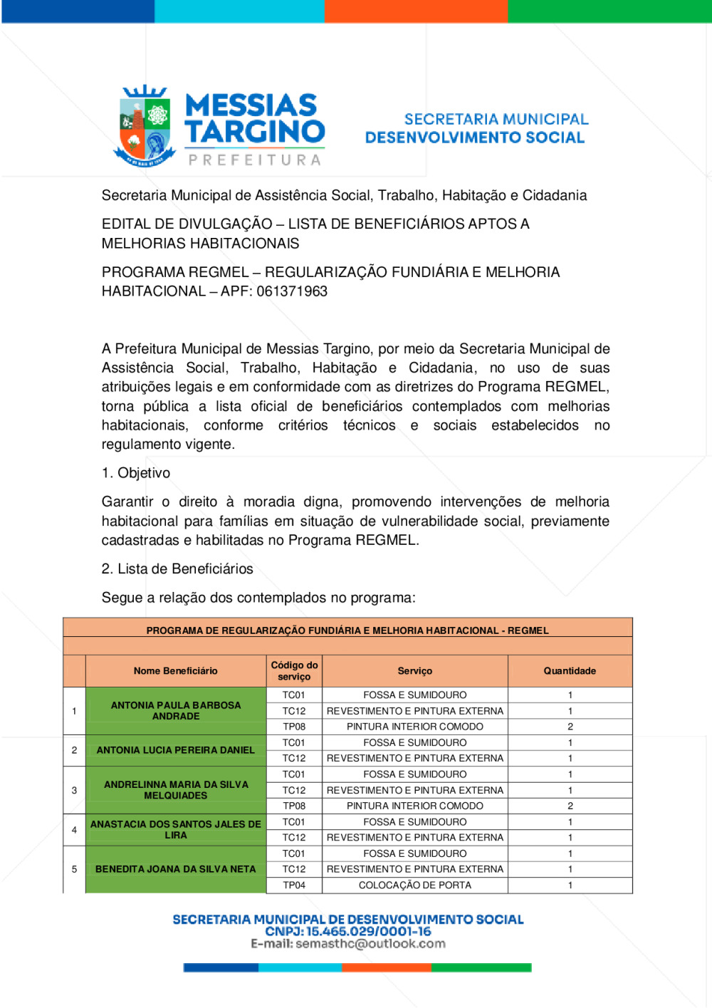 EDITAL DE DIVULGAÇÃO – LISTA DE BENEFICIÁRIOS APTOS A MELHORIAS HABITACIONAIS