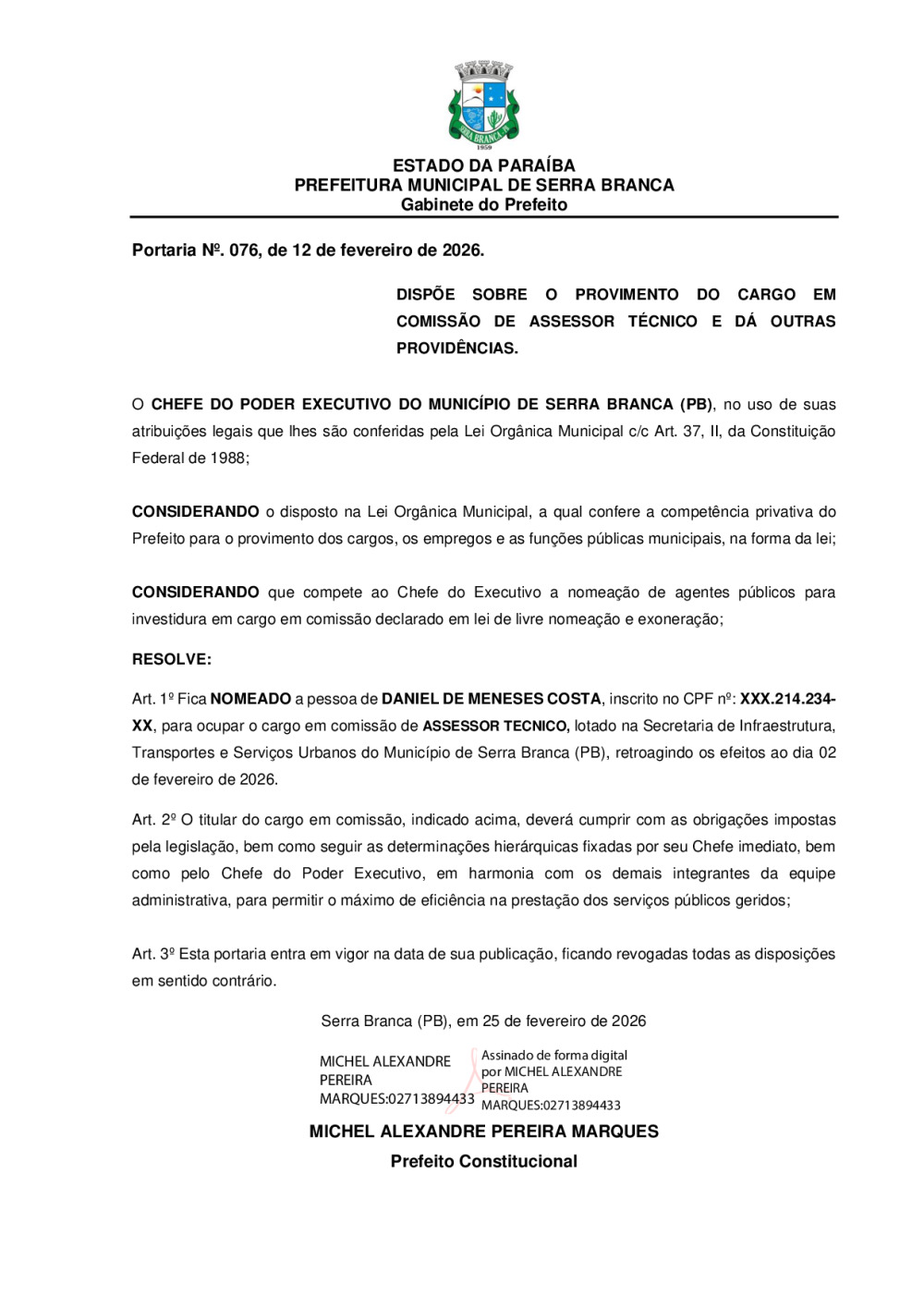PORTARIA N° 0076/2026 - NOMEAÇÃO DE DANIEL DE MENESES COSTA