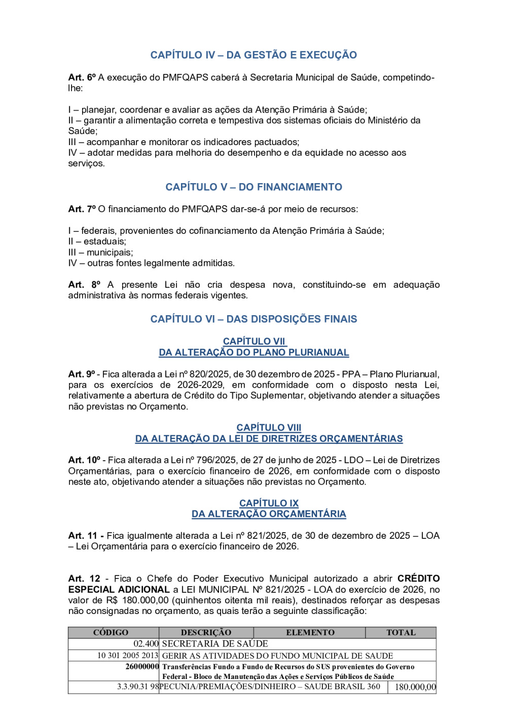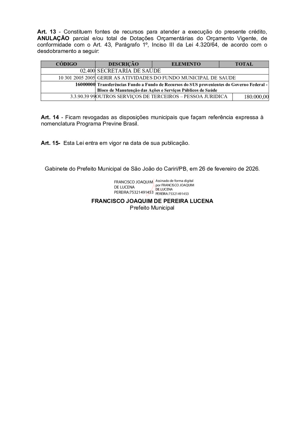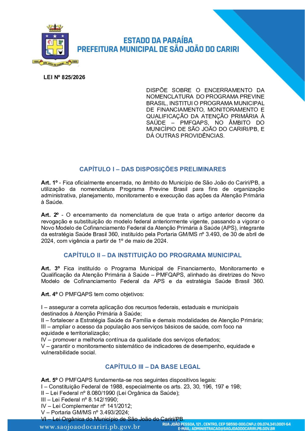 LEI 825/2026 - DISPÕE SOBRE O ENCERRAMENTO DA NOMENCLATURA DO PROGRAMA PREVINE BRASIL, INSTITUI O PROGRAMA MUNICIPAL DE FINANCIAMENTO, MONITORAMENTO E QUALIFICAÇÃO DA ATENÇÃO PRIMÁRIA À SAÚDE – PMFQAPS, NO ÂMBITO DO MUNICÍPIO DE SÃO JOÃO DO CARIRI/PB, E DÁ OUTRAS PROVIDÊNCIAS