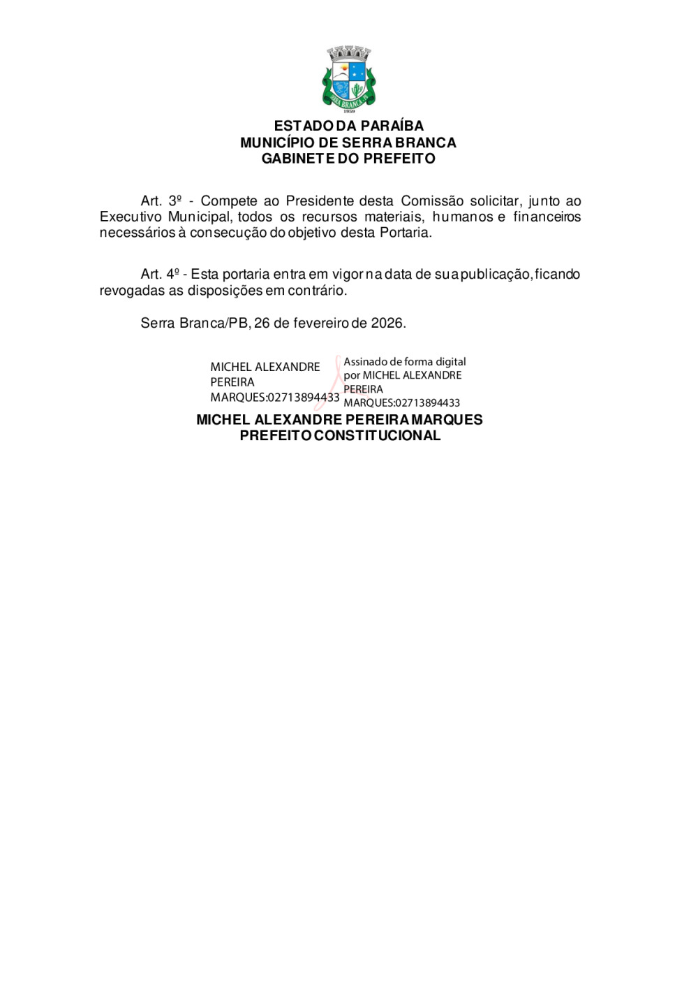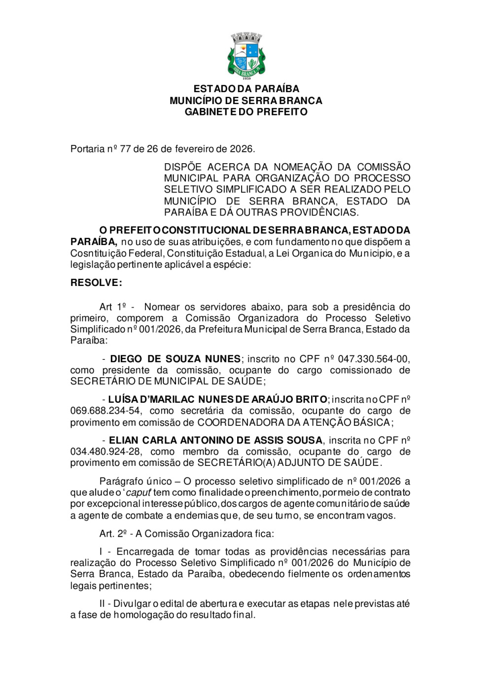 PORTARIA N° 0077/2026 - DISPÕE ACERCA DA NOMEAÇÃO DA COMISSÃO MUNICIPAL PARA ORGANIZAÇÃO DO PROCESSO SELETIVO SIMPLIFICADO A SER REALIZADO PELO MUNICÍPIO