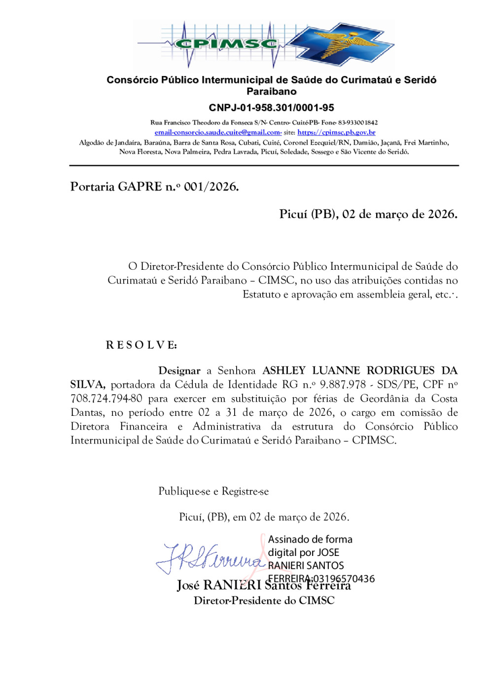 Conforme MP n° 2.200-2 de 24/08/2001, que institui a infraestrutura de chaves Públicas. Matéria Publicada no Diário Oficial do Consórcio Intermunicipal de Saúde do Curimataú e Seridó Paraibano/PB no dia - Edição 01419.