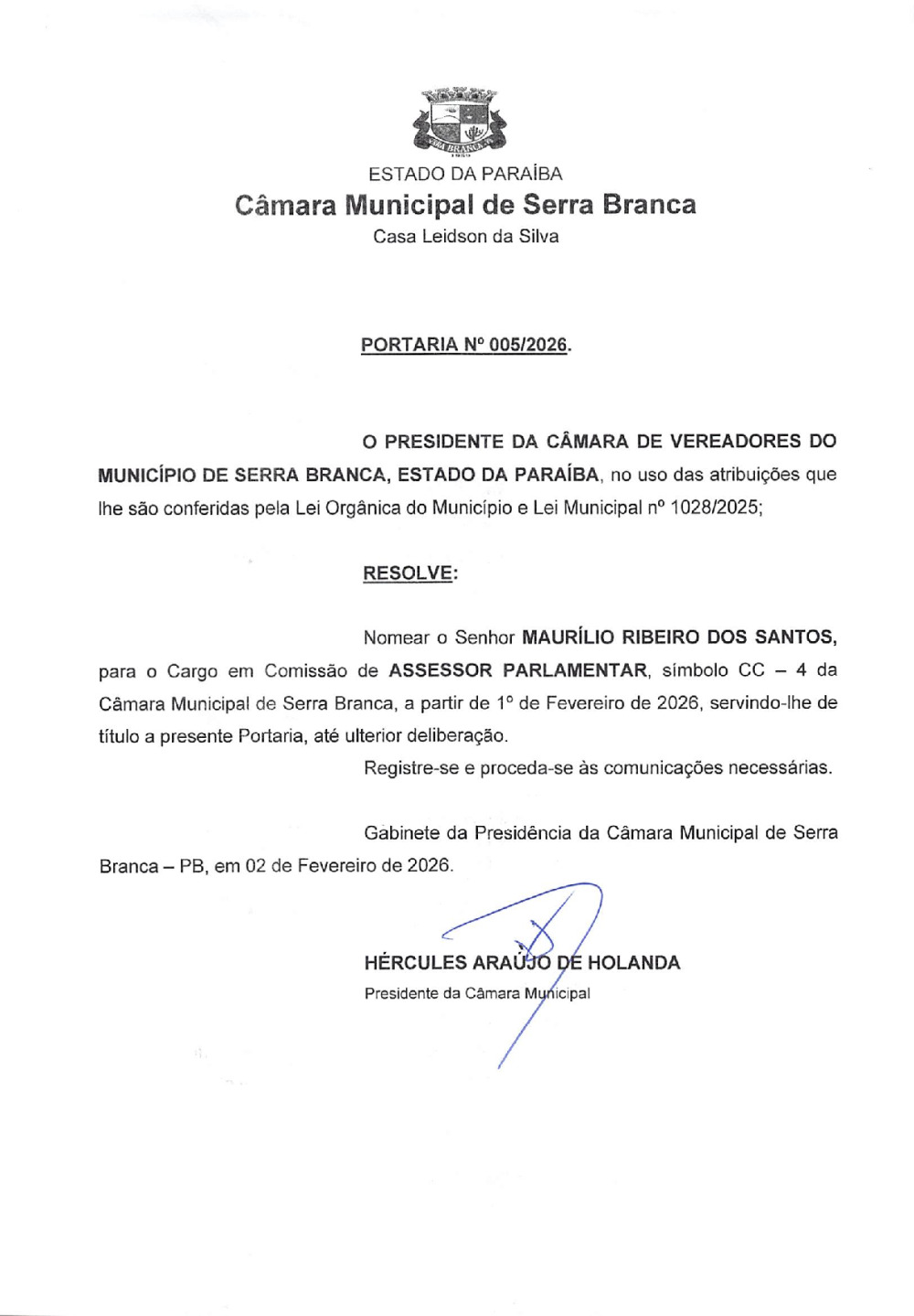 PORTARIA Nº 0005/2026 - NOMEAÇÃO DE MAURÍLIO RIBEIRO DOS SANTOS