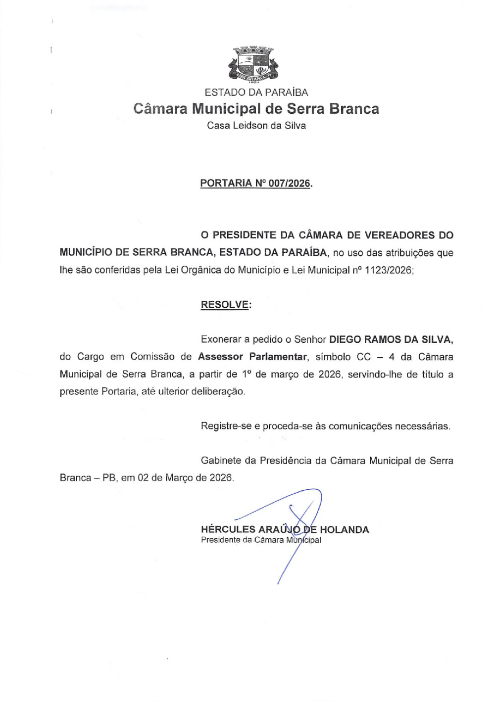 PORTARIA Nº 0007/2026 - EXONERAÇÃO A PEDIDO DE DIEGO RAMOS DA SILVA